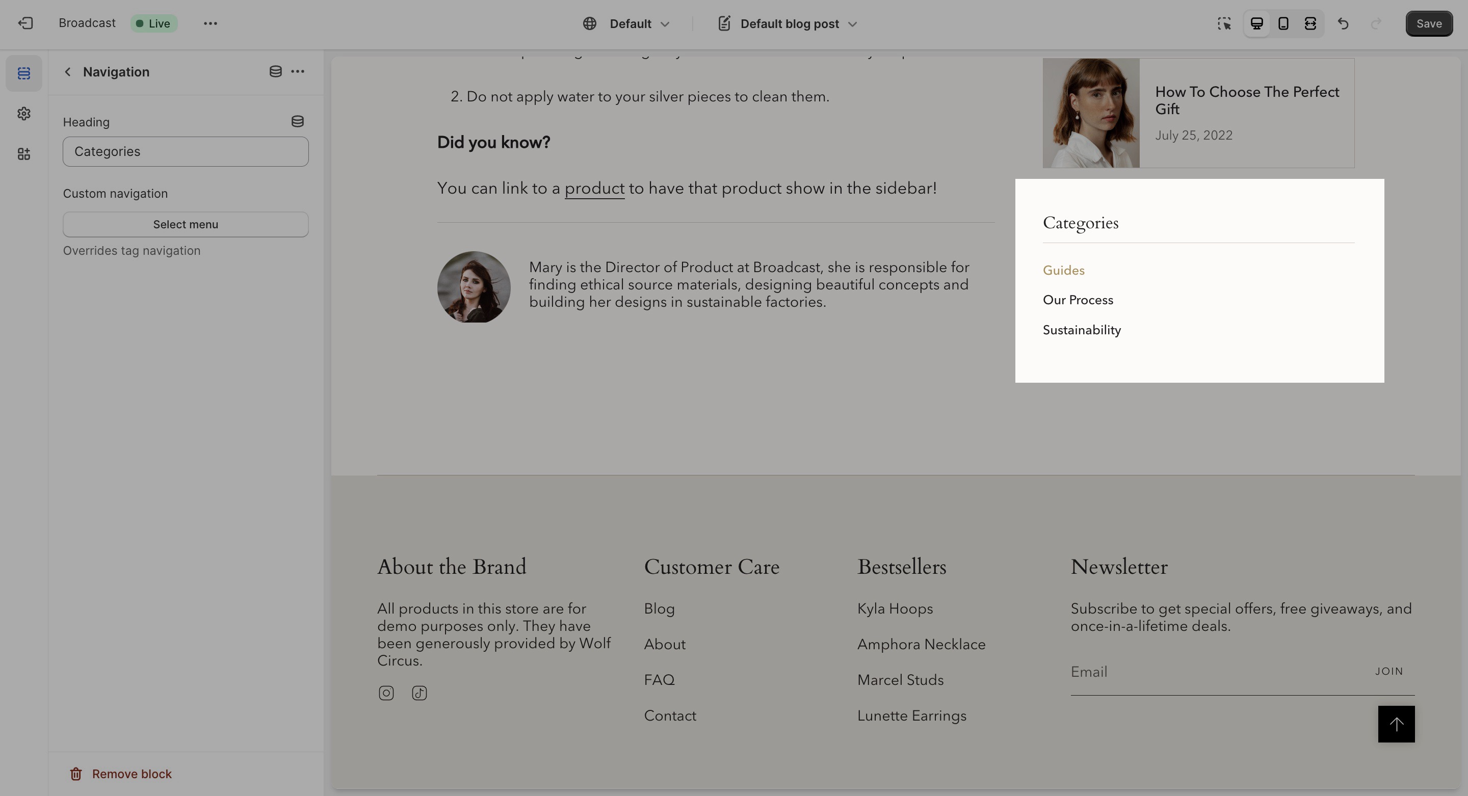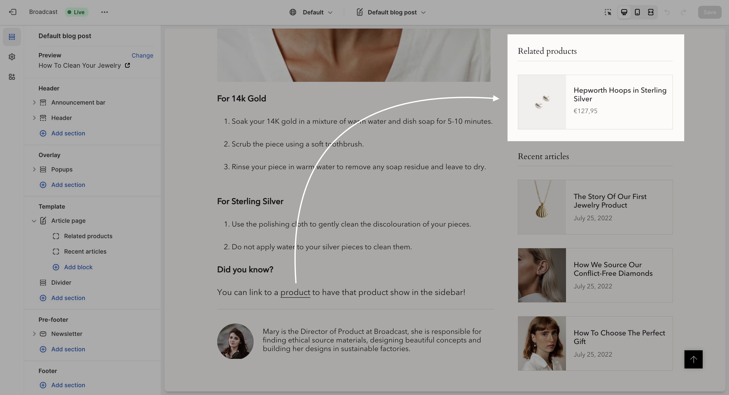 When you add a link to any product page inside your blog post - If enabled, Broadcast will display a product card in the sidebar of your article page.