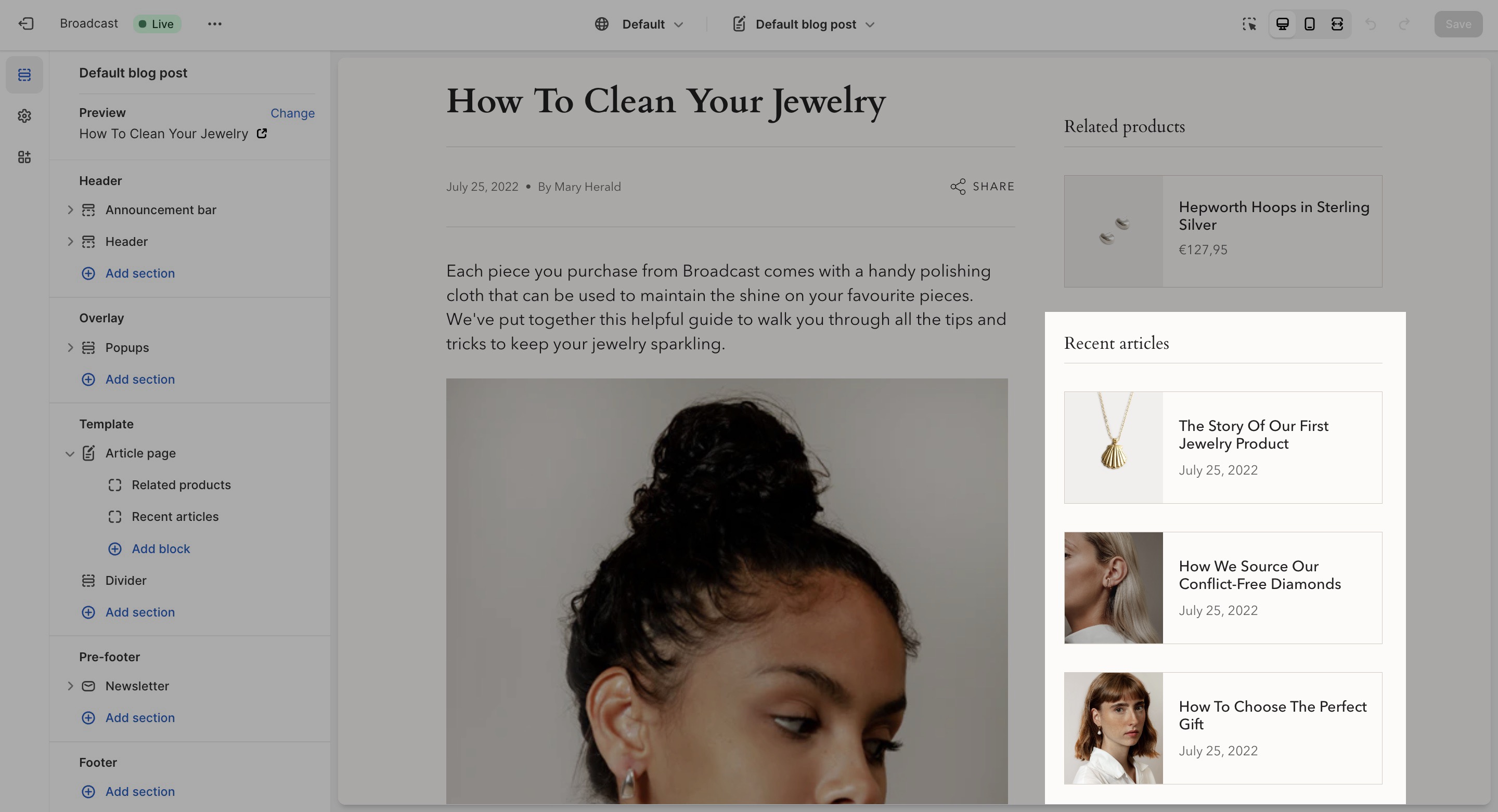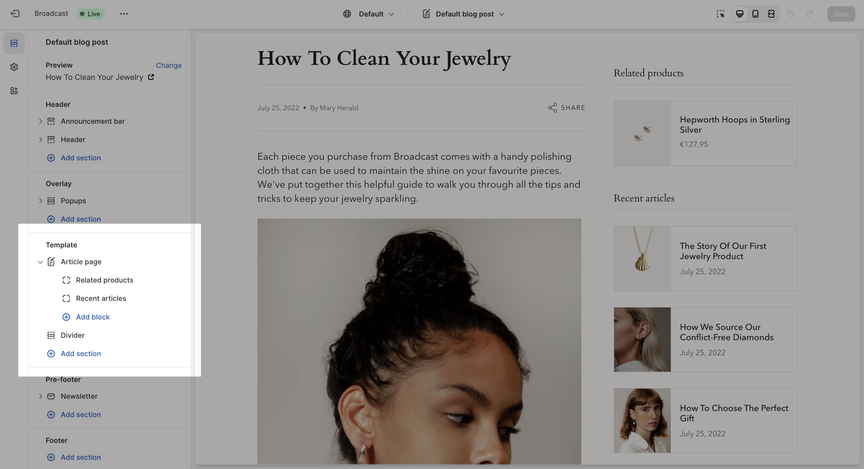 Broadcast theme blocks for Blog post pages and blog post templates help you customize the primary or core content for your blog post also known as article pages.
