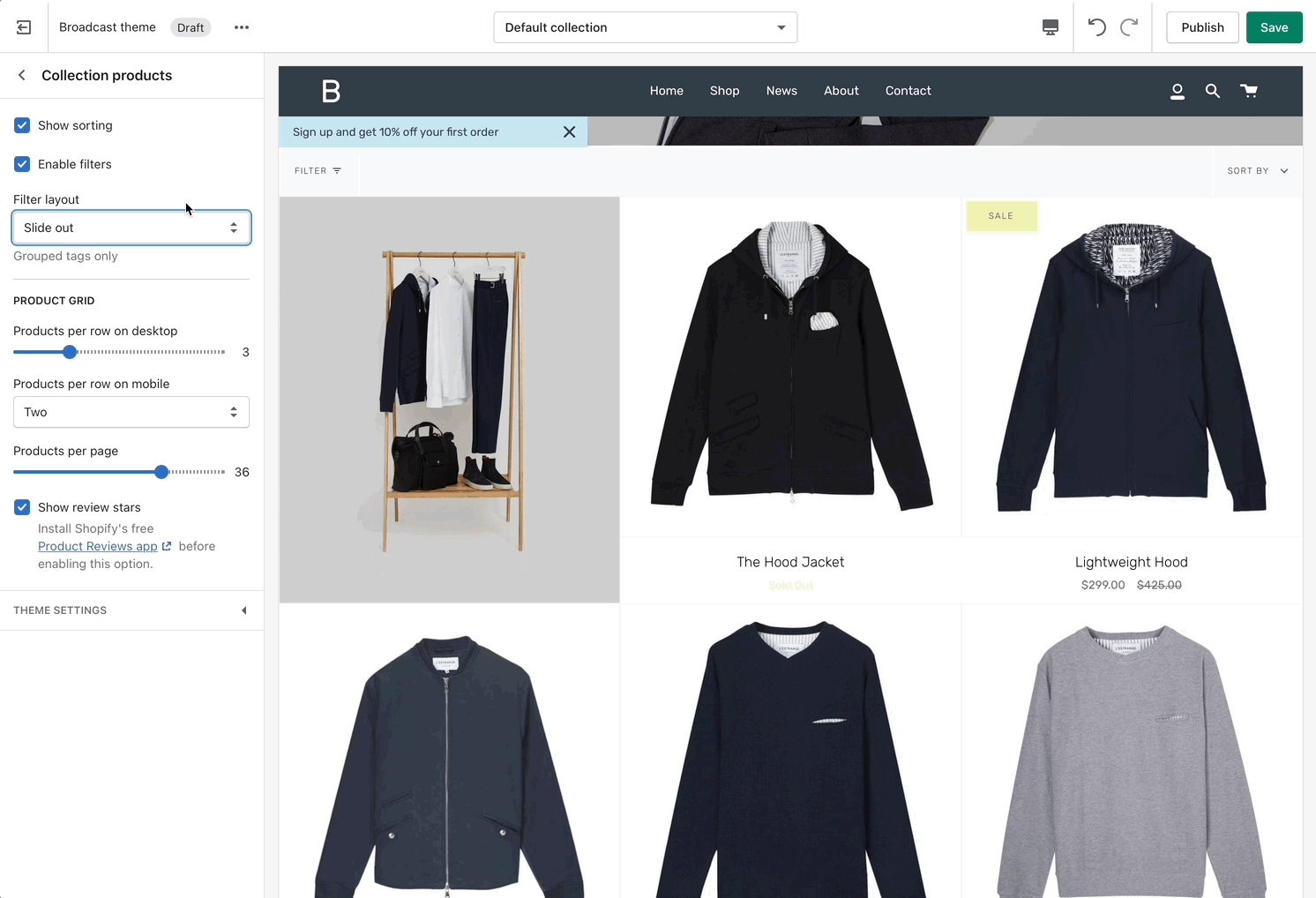 Setup with Broadcast is fast and simple. Using the Theme Editor, navigate to any collection page (or choose the default collection template) and click on 'Collection products' to view the settings: