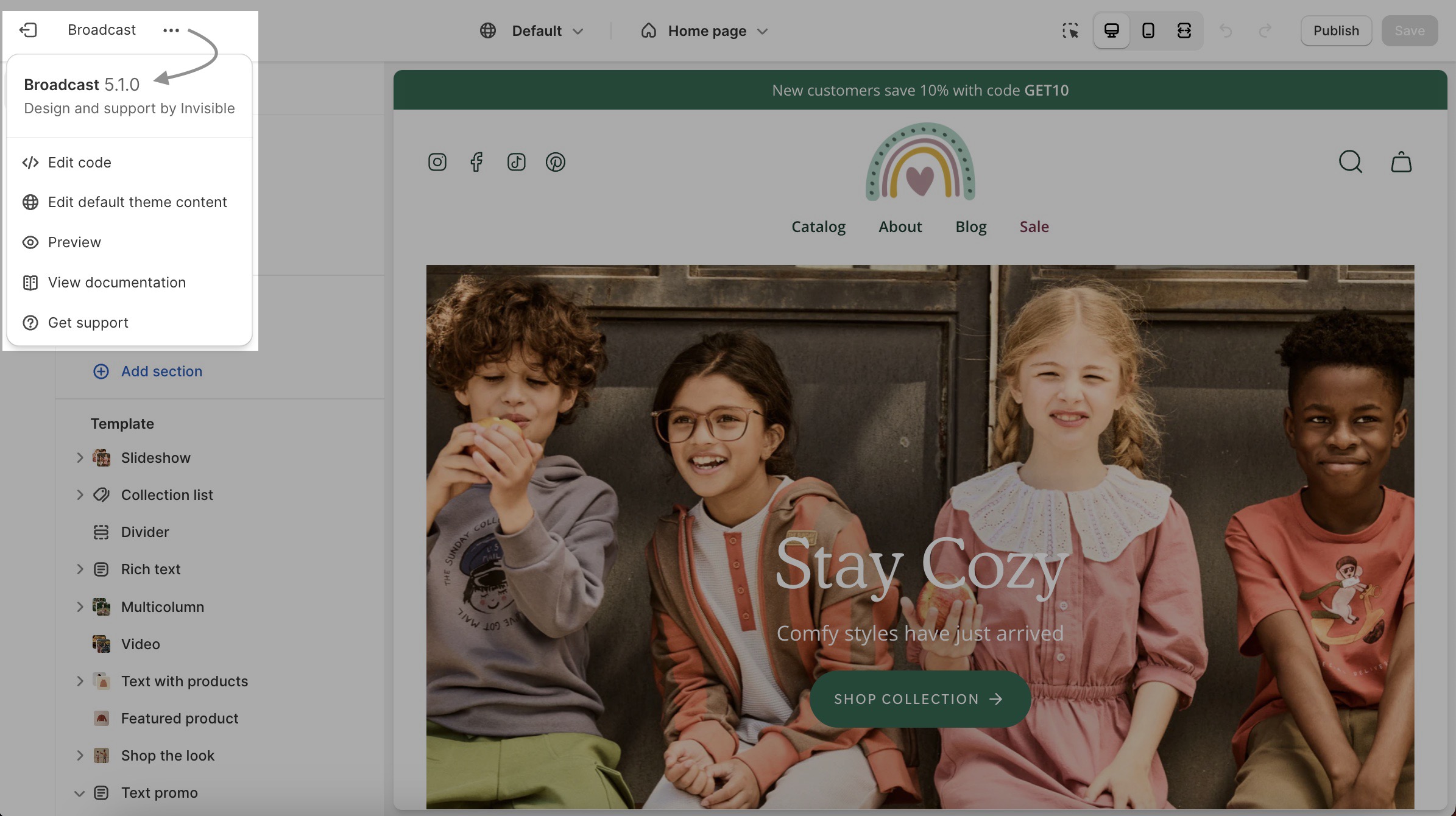To check your version of Broadcast, click on the ellipses (three dots) icon at the top of the Theme Editor to view theme actions including the version number: