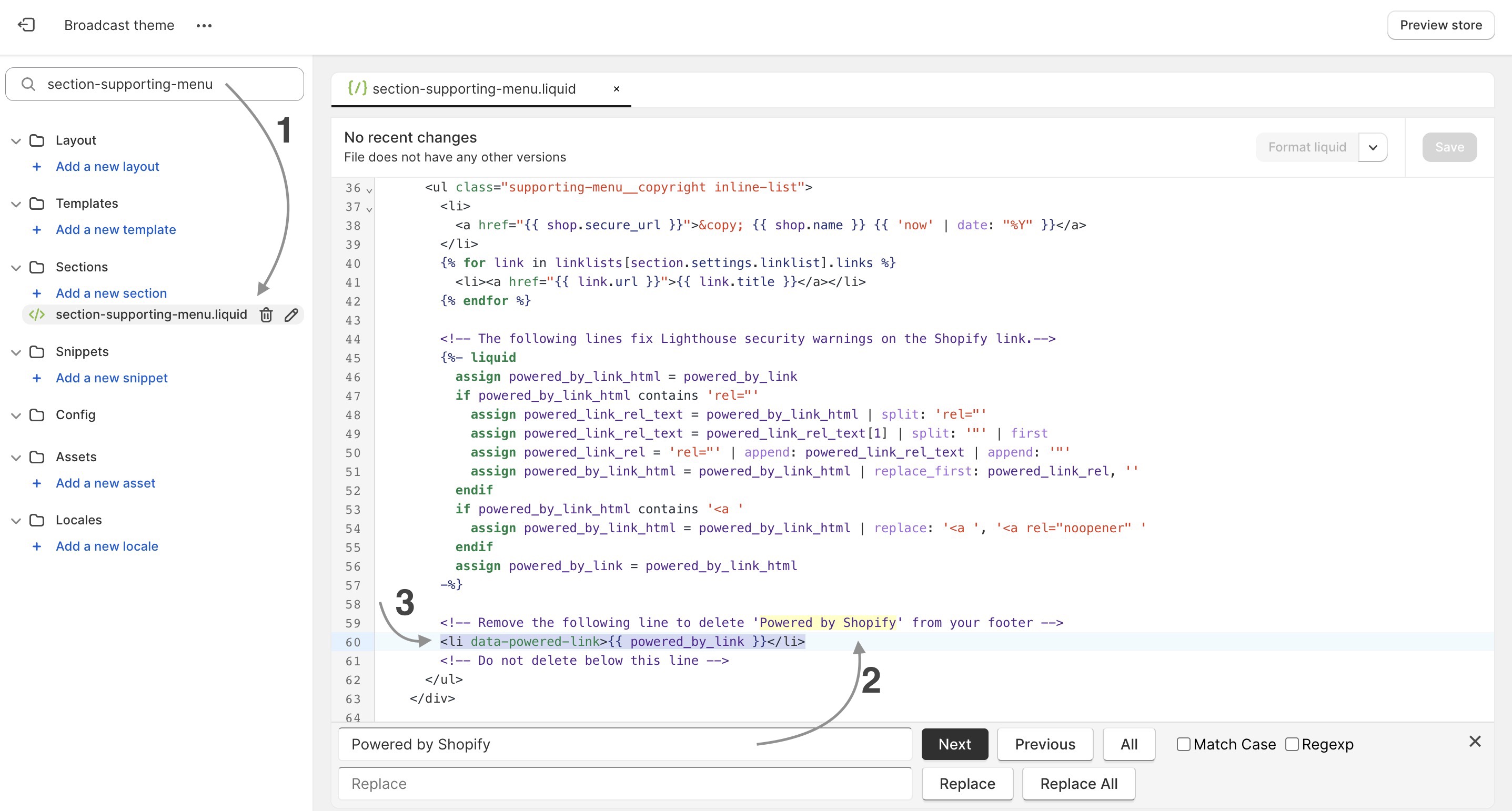 2. Search for `Powered by Shopify` in the code area