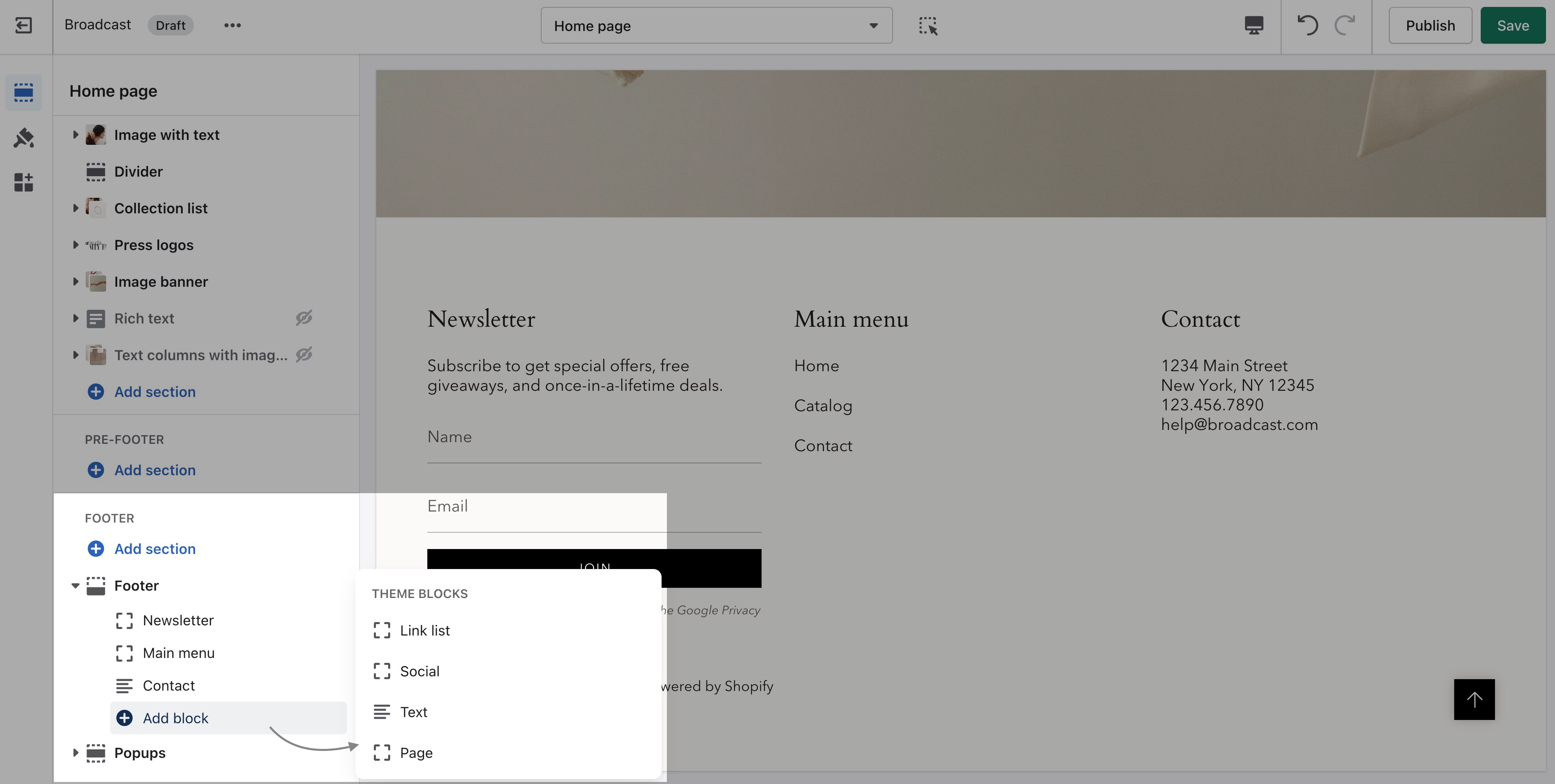 Broadcast footer theme blocks help you customize content columns within the footer: