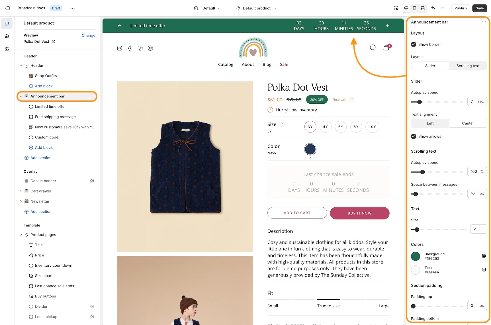Announcement bar section settings and options