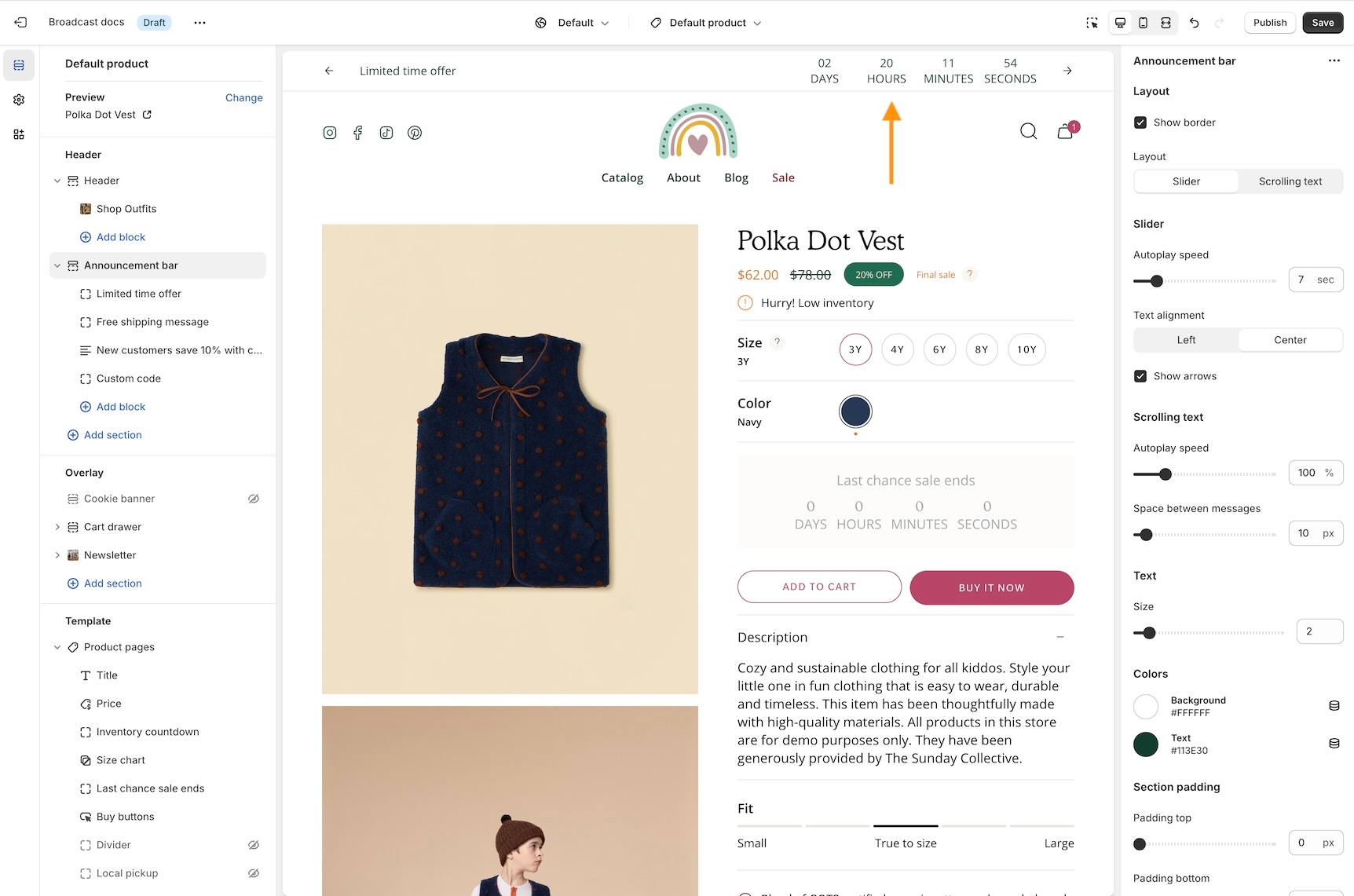 Broadcast includes several options to customize the announcement bar in the header area fully. You can choose from different styles like a slider or scrolling announcement bar and add rich blocks to enhance the promotional information for your customers: