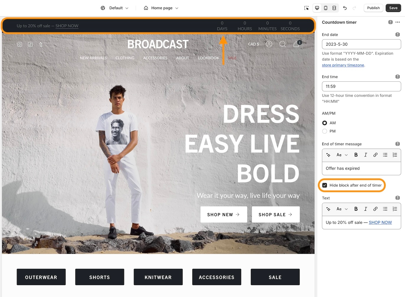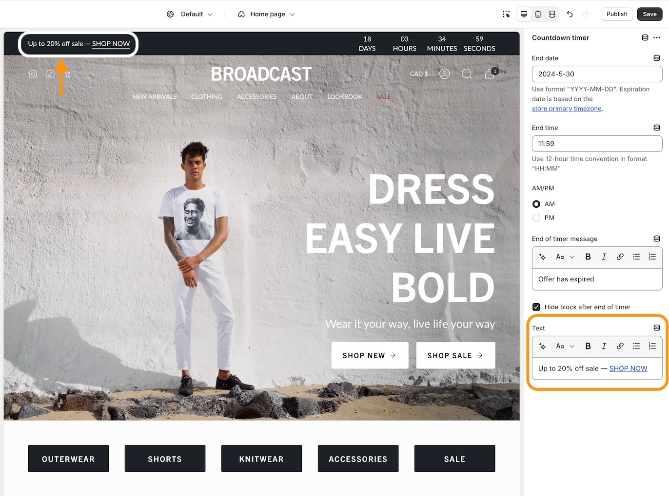 Broadcast includes a fully-featured countdown timer block for the announcement bar. Add the block to help highlight your flash sales and improve conversions.