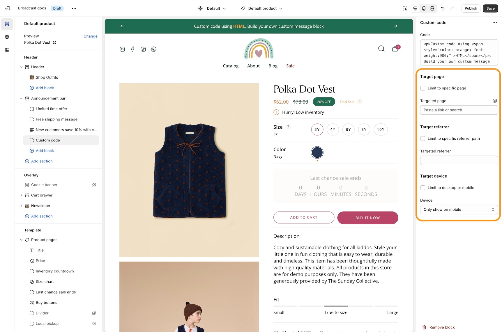 Broadcast includes target options to help you display custom messages on certain site pages. Use the Target page feature to customize which announcement bar messages are displayed on various pages of your site.