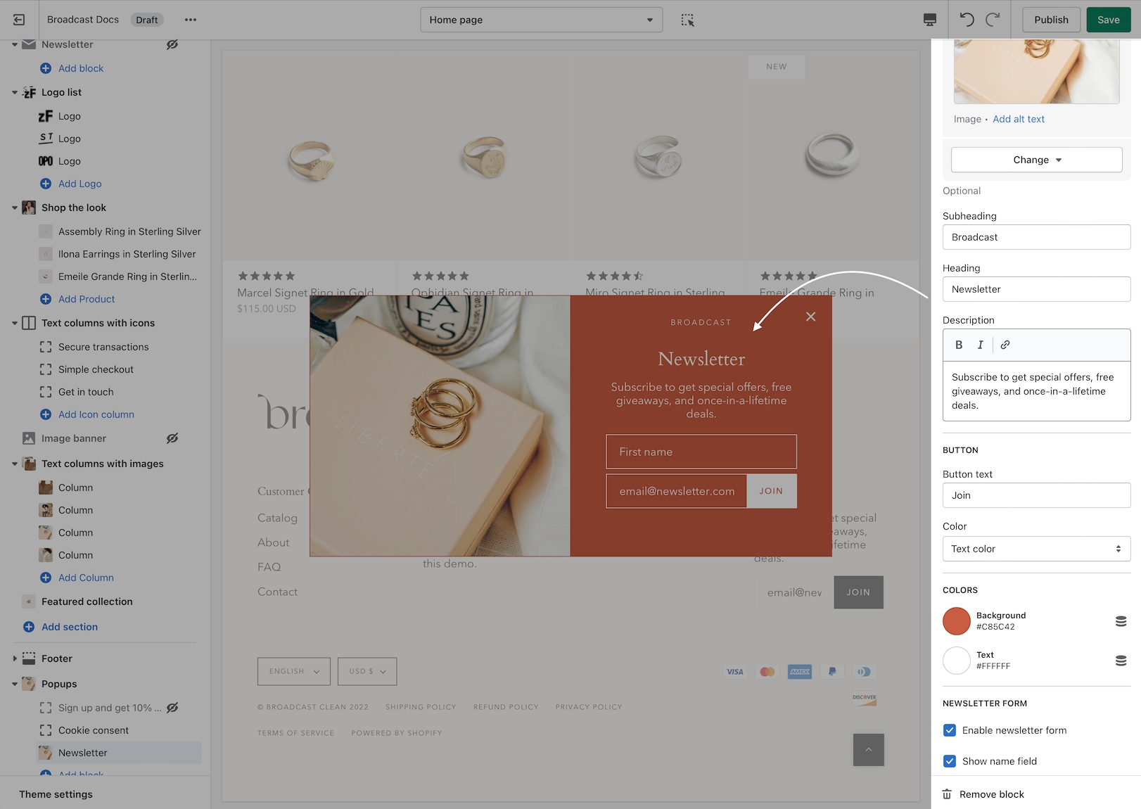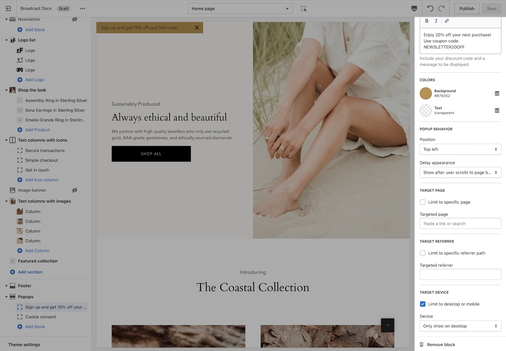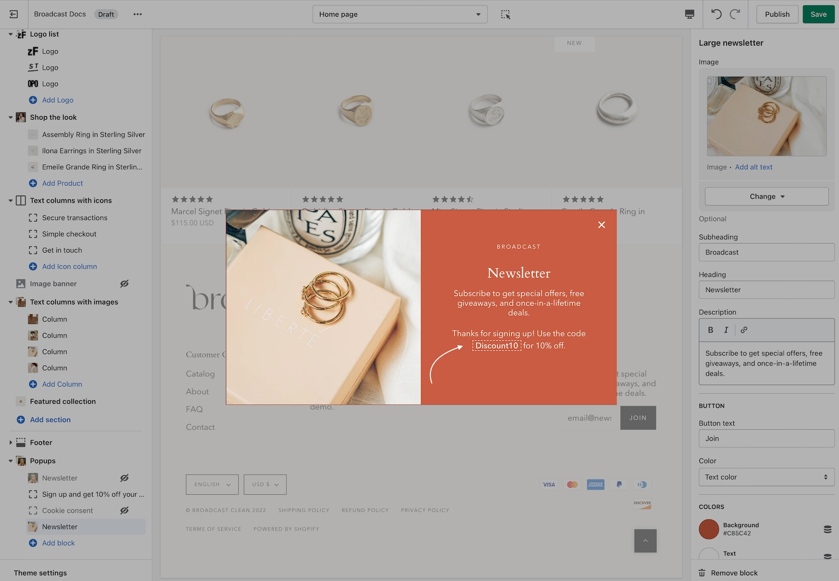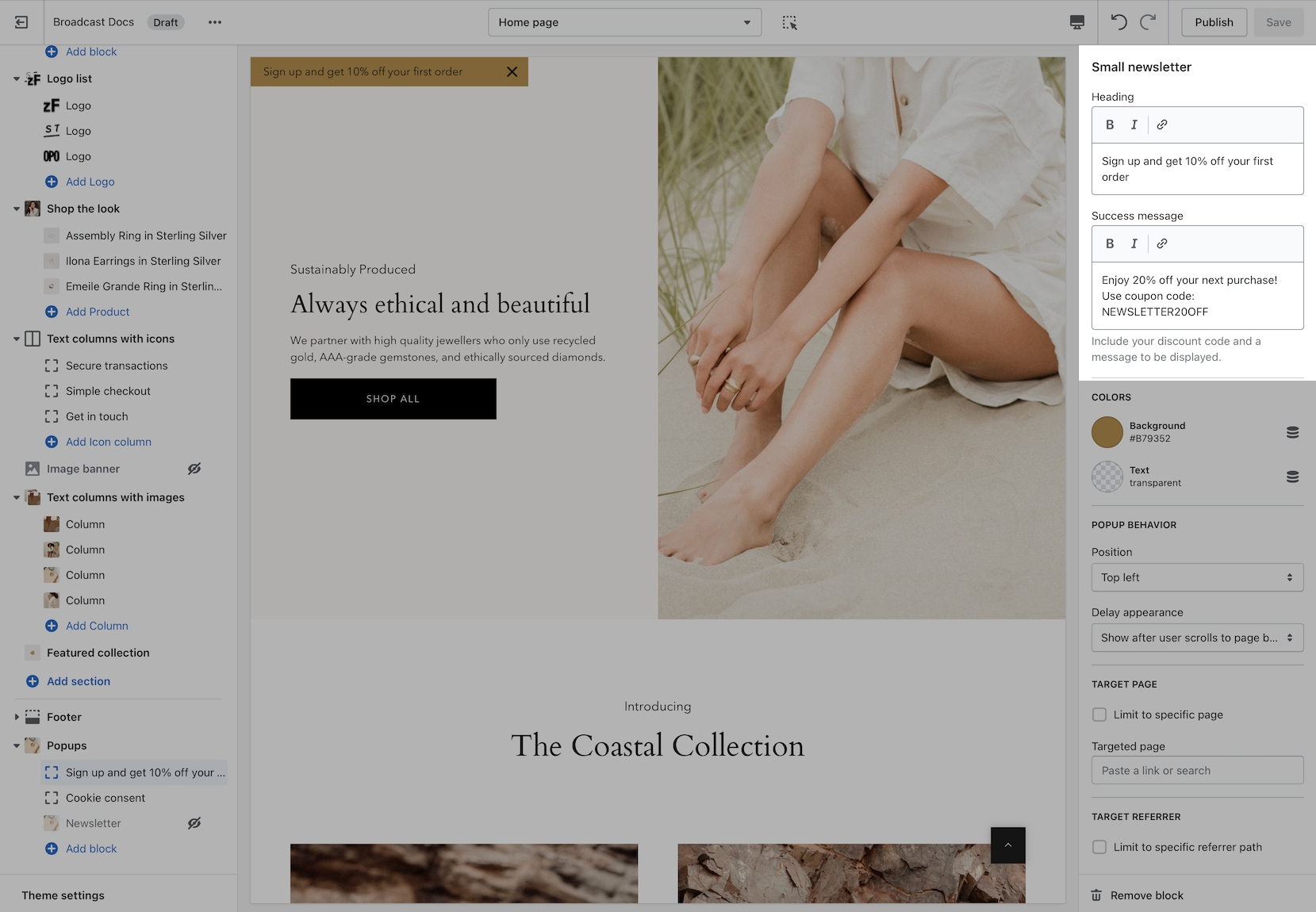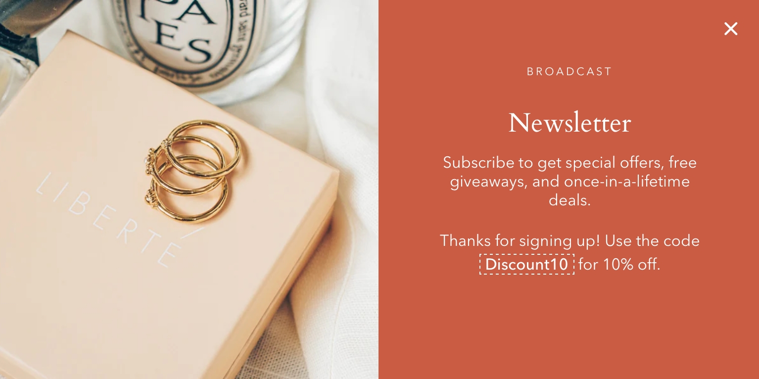 When using the newsletter popups in Broadcast, a coupon code can be displayed for your customer after they successfully enter their email address: