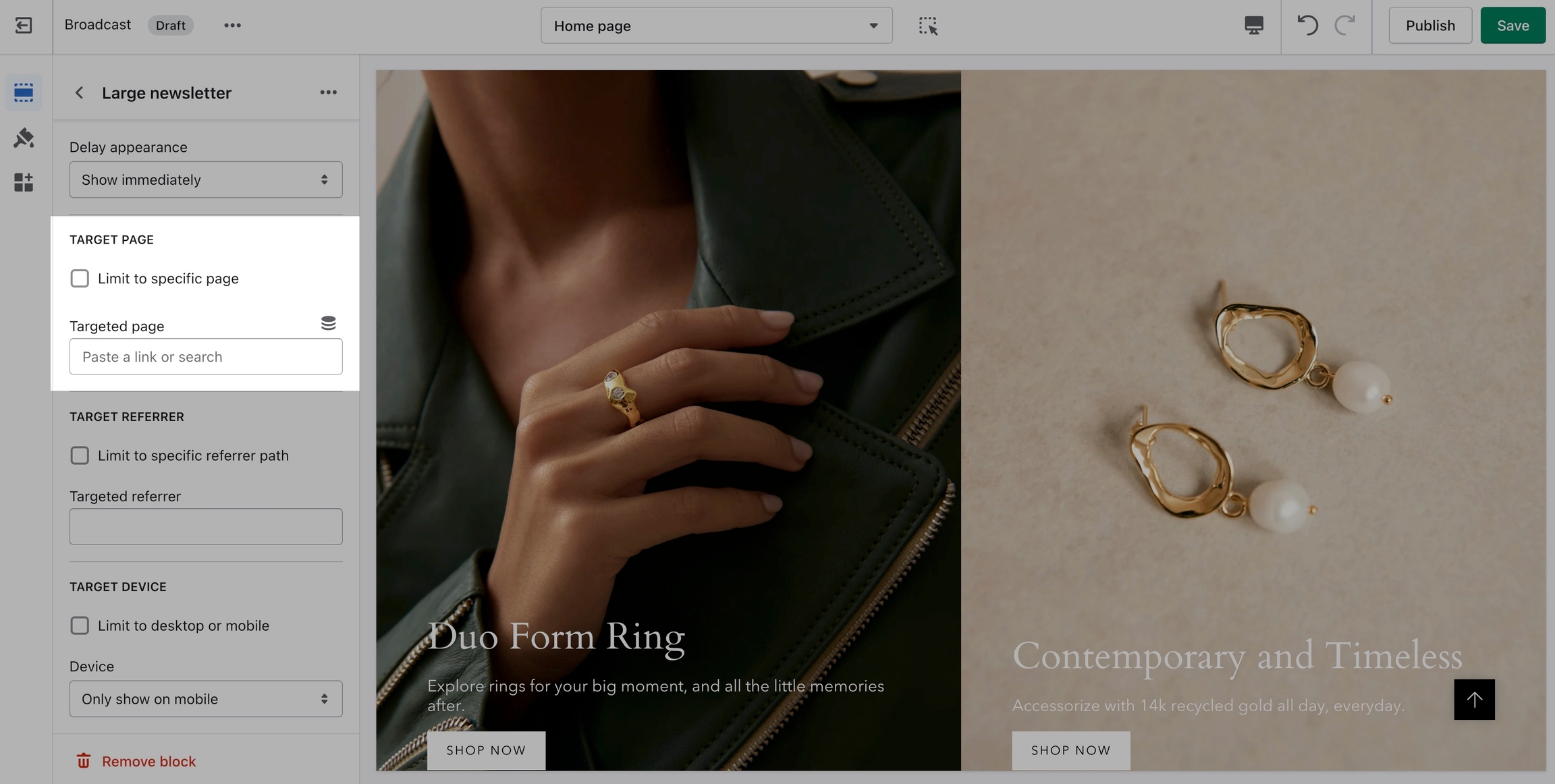 Display a custom popup to your customers only when the customer is browsing a certain page, product, collection, or blog post on your site.
