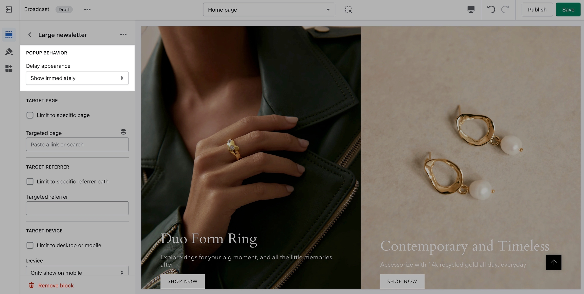 Popups can appear based on time or other behavior. Setting options include: