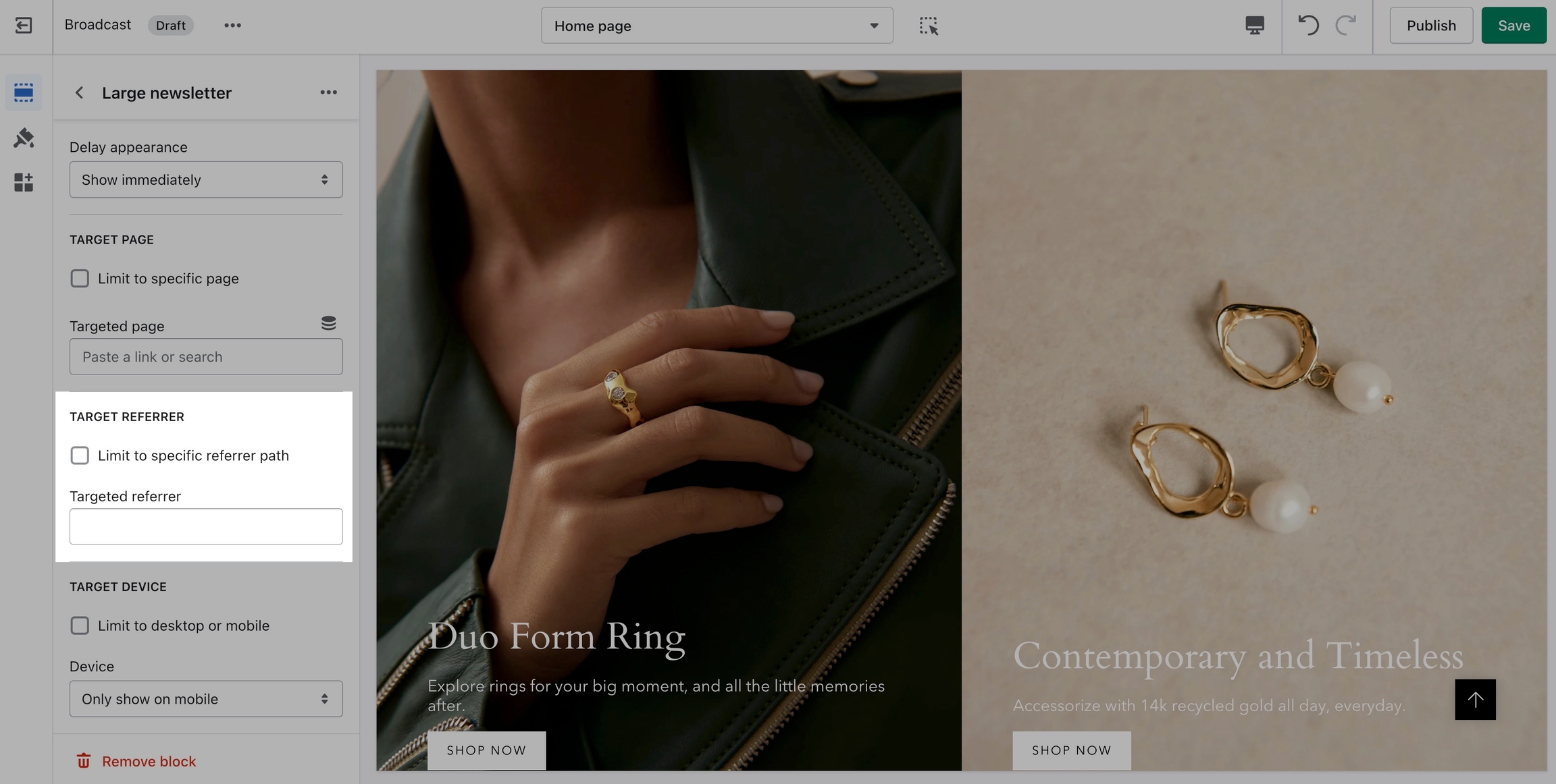 Target a specific audience by using Target Referrer. Your popup will only appear when the customer arrives at your site from a certain path or location.