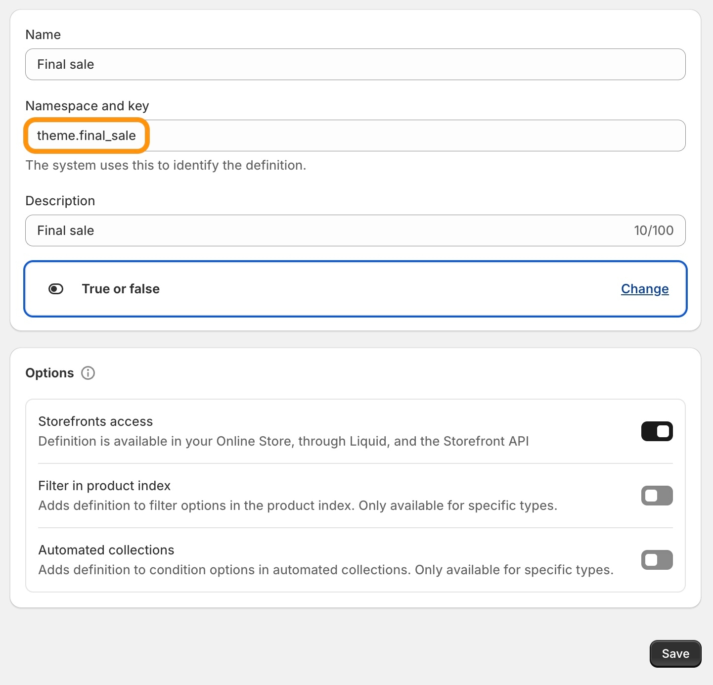 This short video demonstrates creating a required custom metafield to display the final sale message on only individual items: