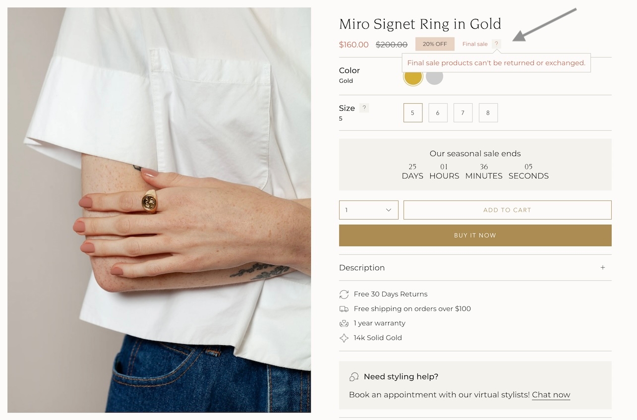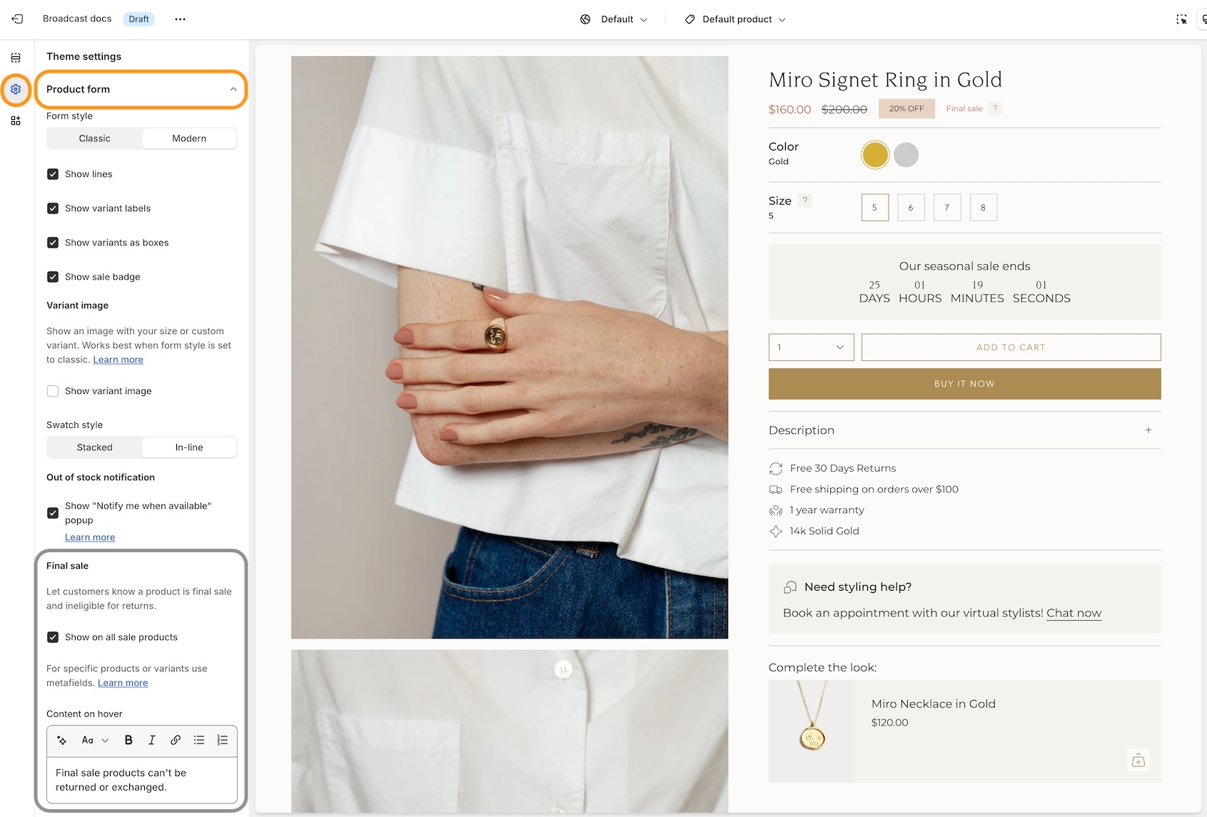 Broadcast includes a Final sale message feature, which allows shoppers to easily identify products on final sale and view details about the sale.