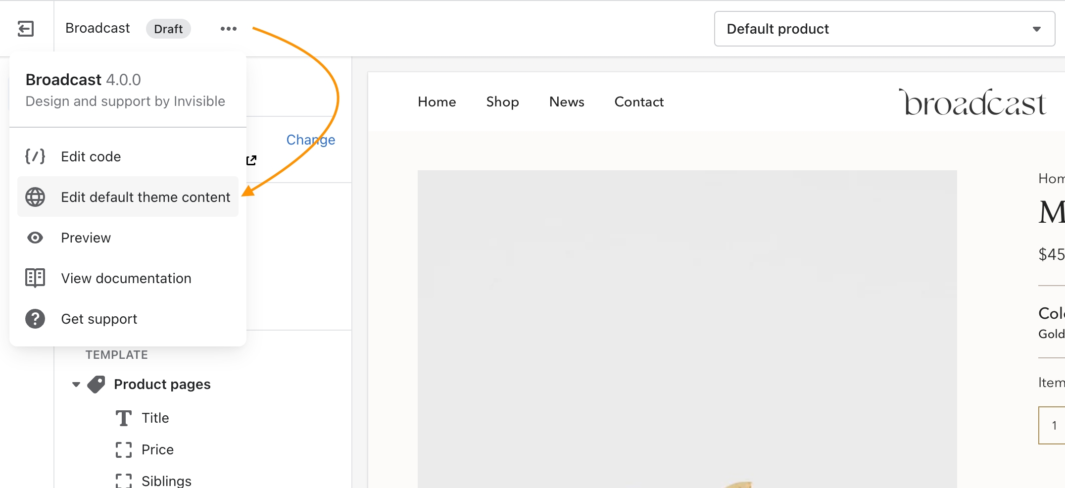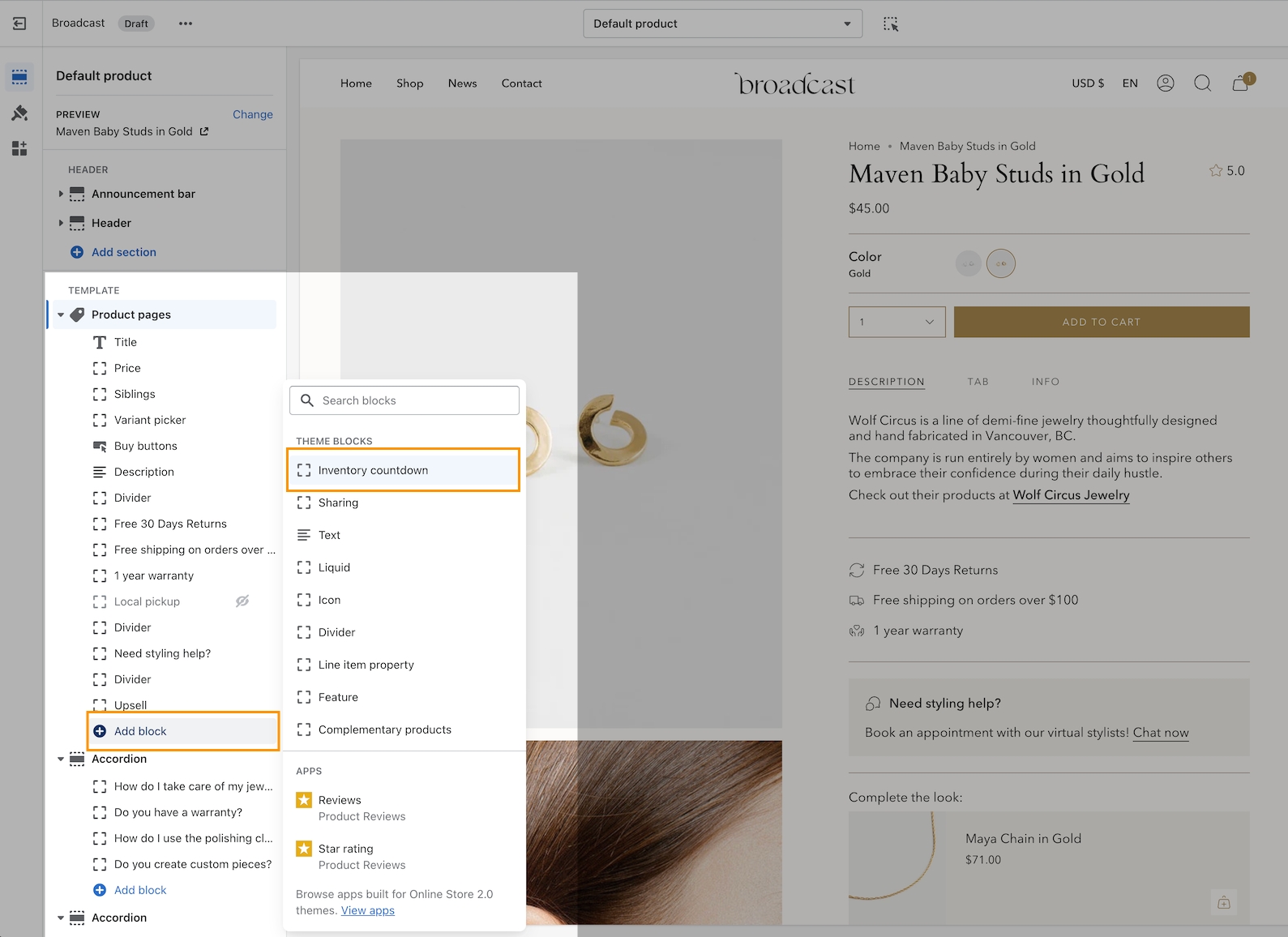In the next step, we'll use the Theme Editor and add the Inventory countdown block to the Product form: