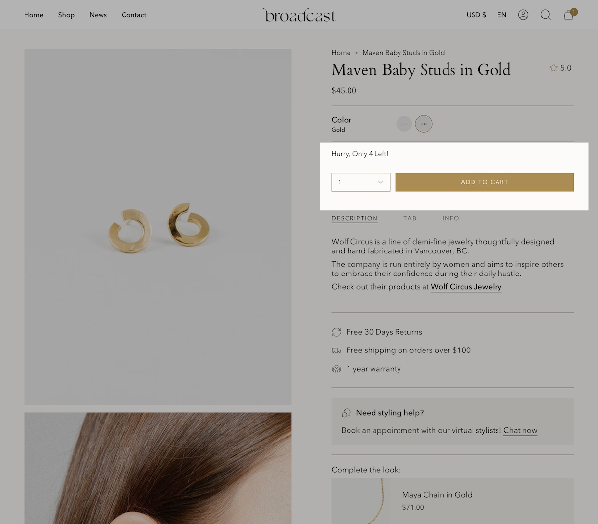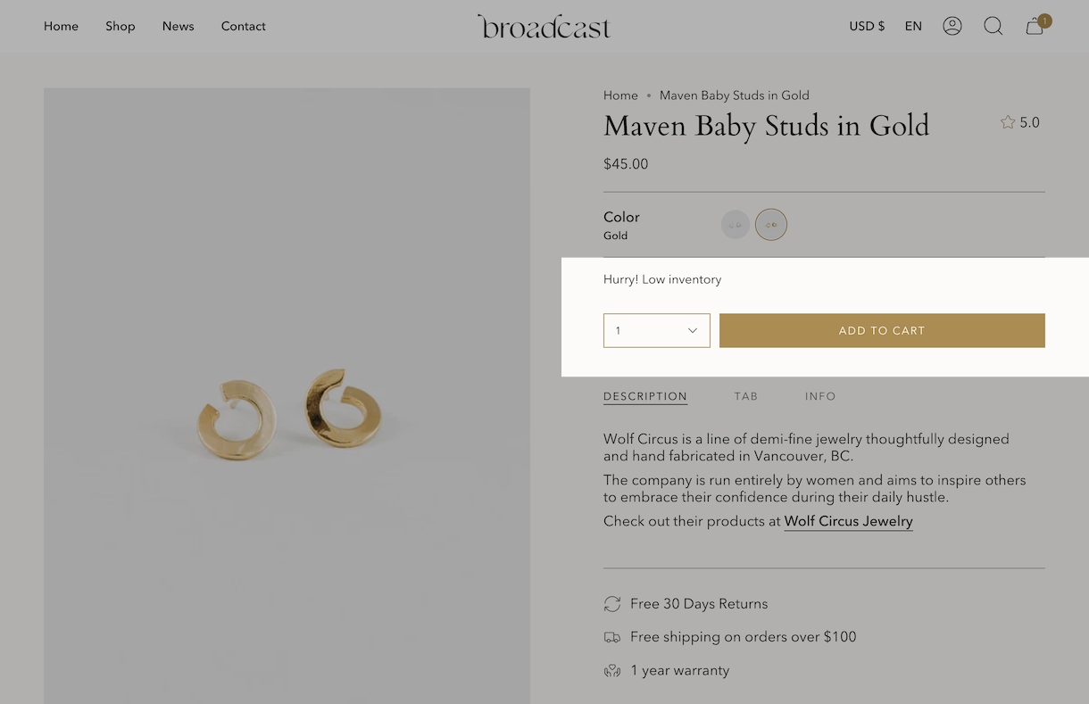 Build a sense of urgency with Broadcast's low inventory message option in the product form:
