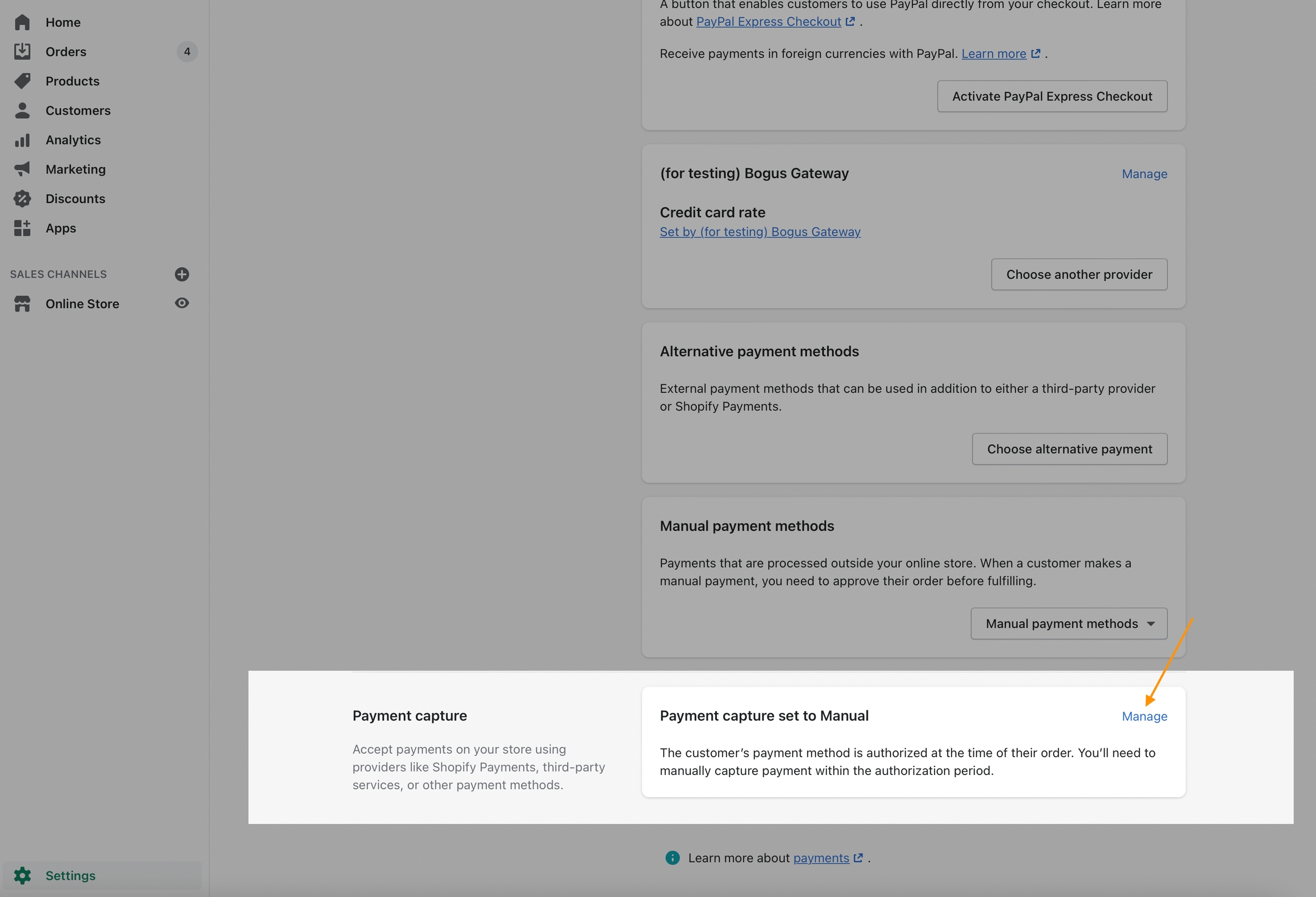 Scroll down to find the Payment capture section, and choose Manage for Payment capture set to Manual: