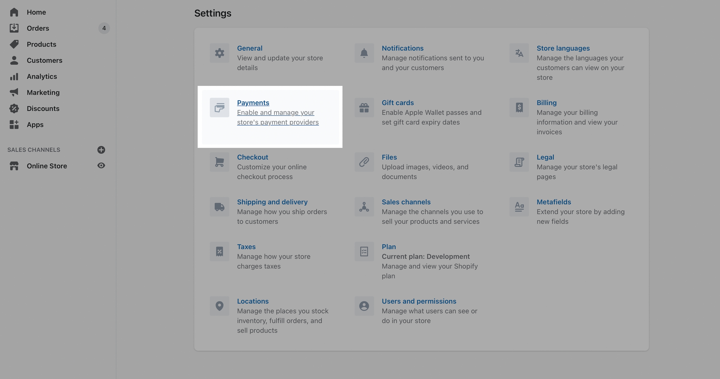 From your Shopify admin, click Settings (bottom left), and then click Payments: