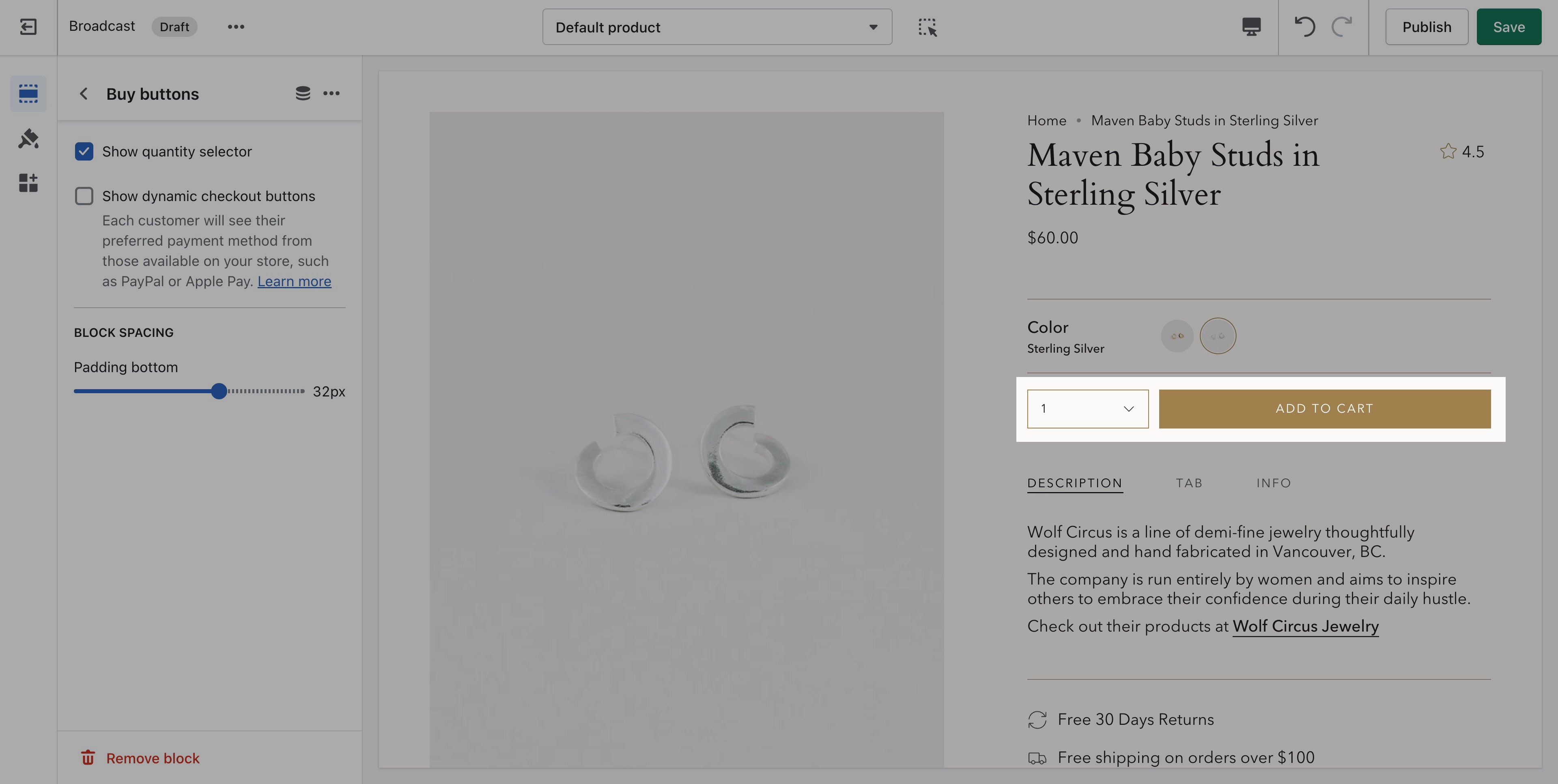 To add items to the cart, we use two main buttons: our theme's own 'add to cart' button and a Shopify button called 'buy it now'