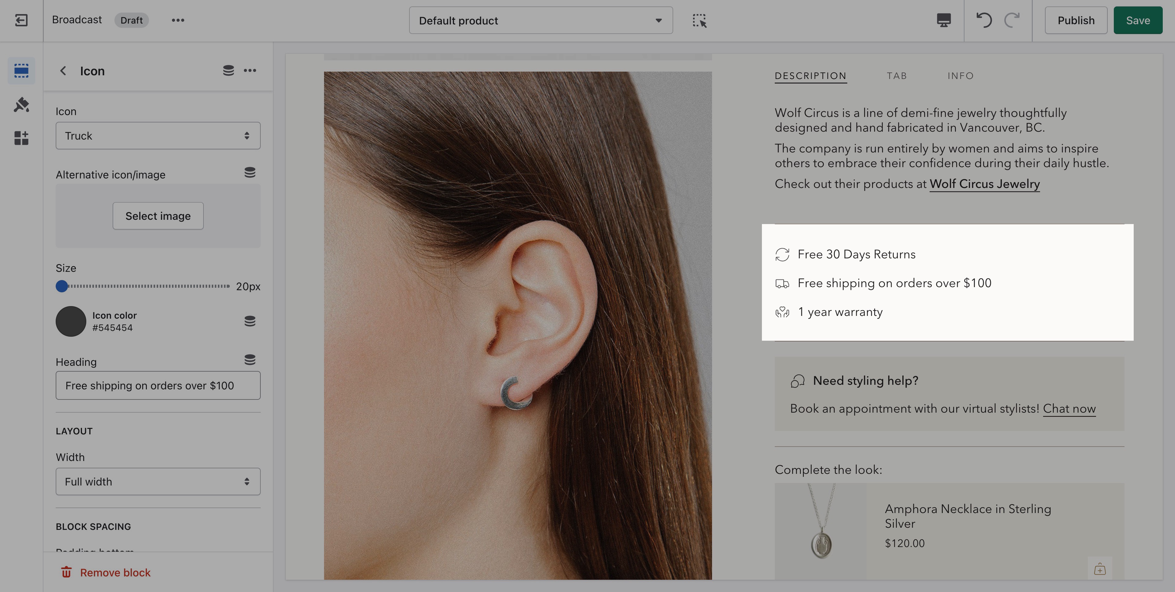 In the block settings, you can choose a custom color for the icon to help draw attention to features or promotions or to simply match the design of the page.