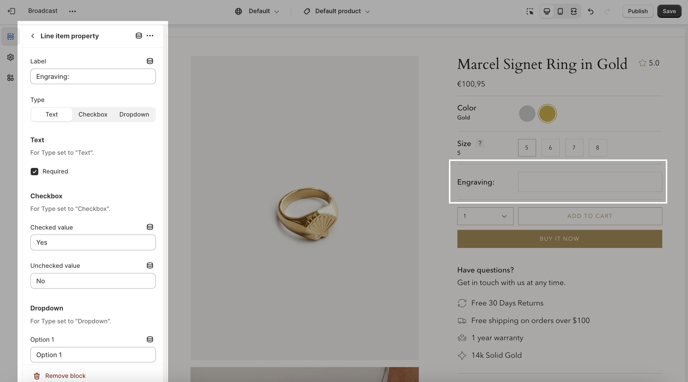 Utilize a line item property block to provide additional details about the product within the order. This feature is ideal for including gift notes or engravings.