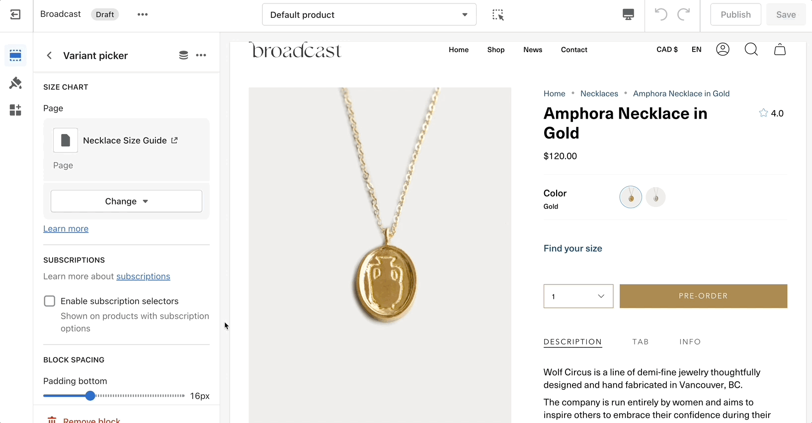 A key feature of the variant picker is the option to add a size chart. Use a regular store page to link into this block.