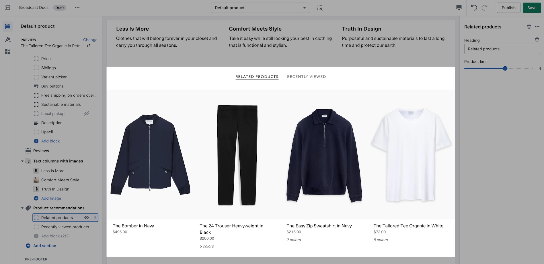 You can configure the title and number of items to display under Related Products using the Product recommendations section.