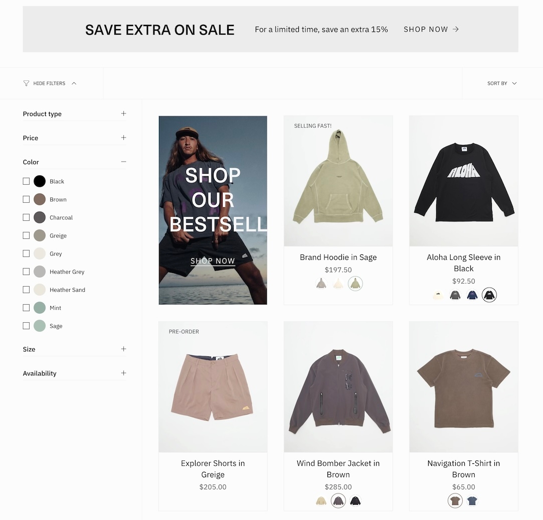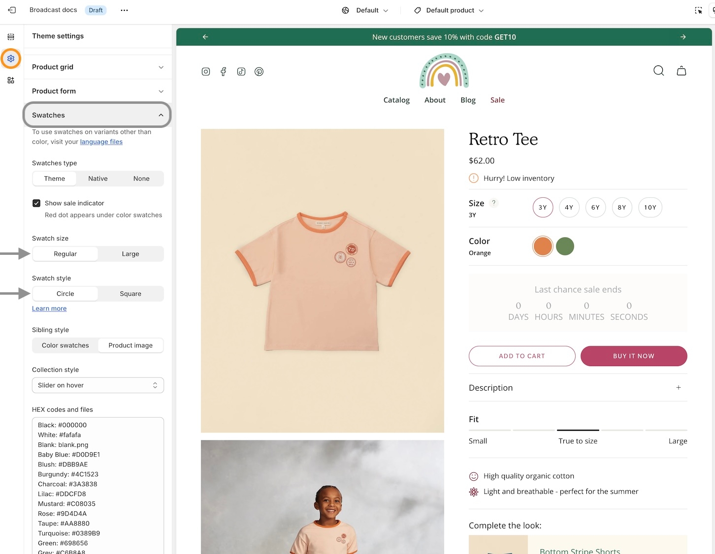 Broadcast makes swatches simple. The theme supports solid color swatches, variant images, and siblings. Let's discover these swatch types and how to use them with your store.