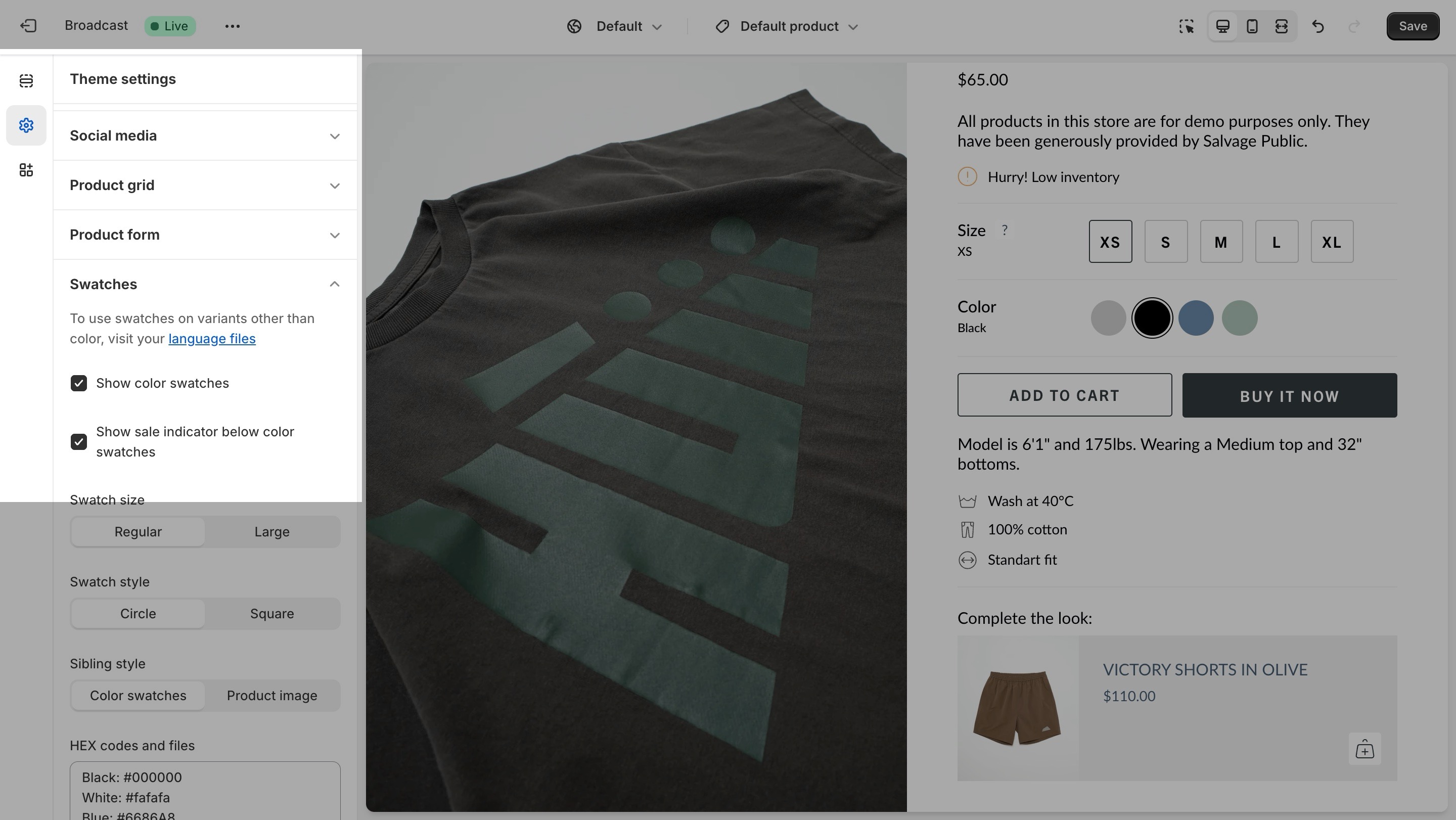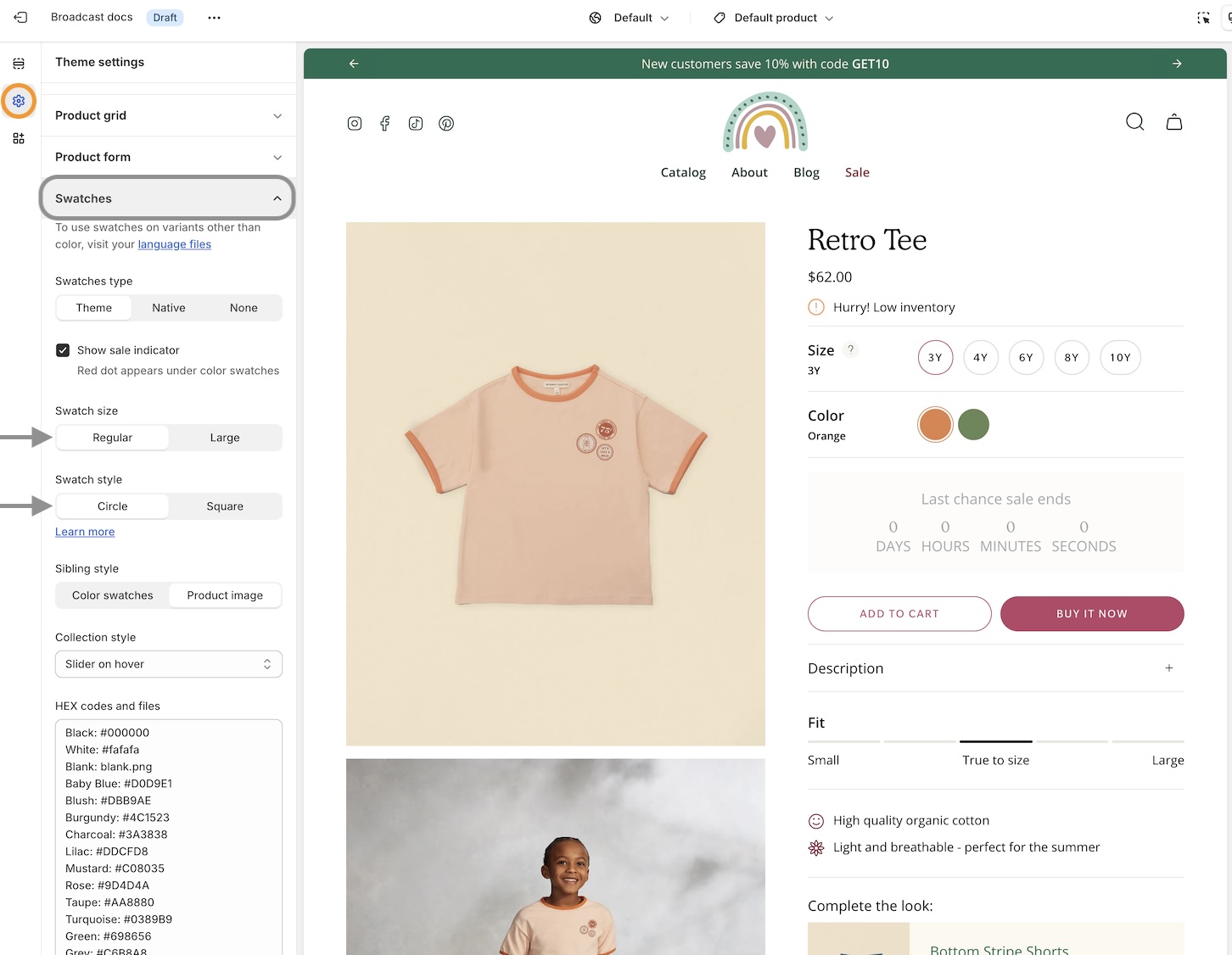 * Configure your swatch options in the Theme Settings -> Swatches. Here, you can customize the solid color swatches to appear in Regular or Large sizes and the shape, Circle or Square: