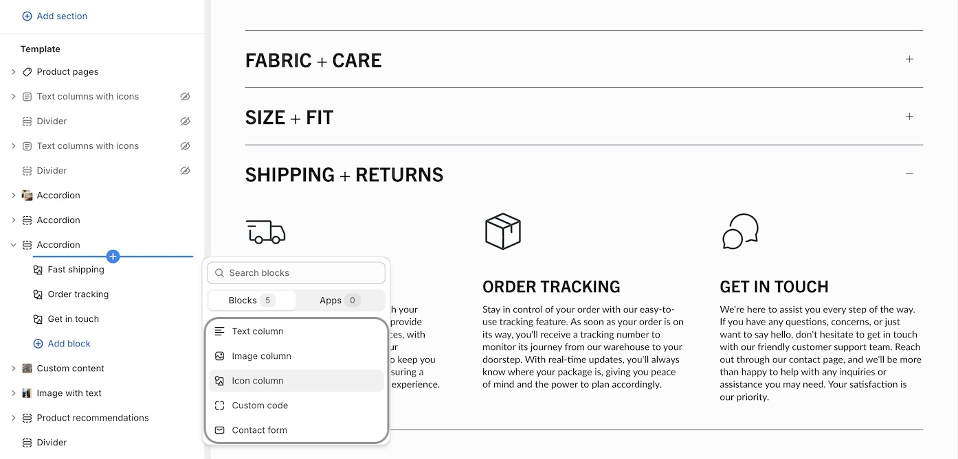 Custom code - Build your custom accordion column with app code, HTML or Liquid.