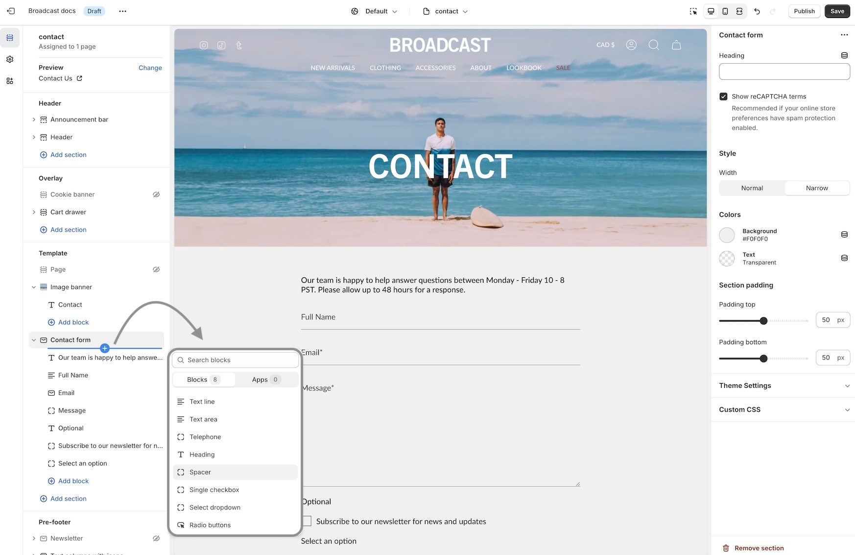 Broadcast includes a full-featured section for your customers to contact you. Easily add form blocks to build a simple or complex contact form and place it anywhere you like. The section can be added to most parts of your store.