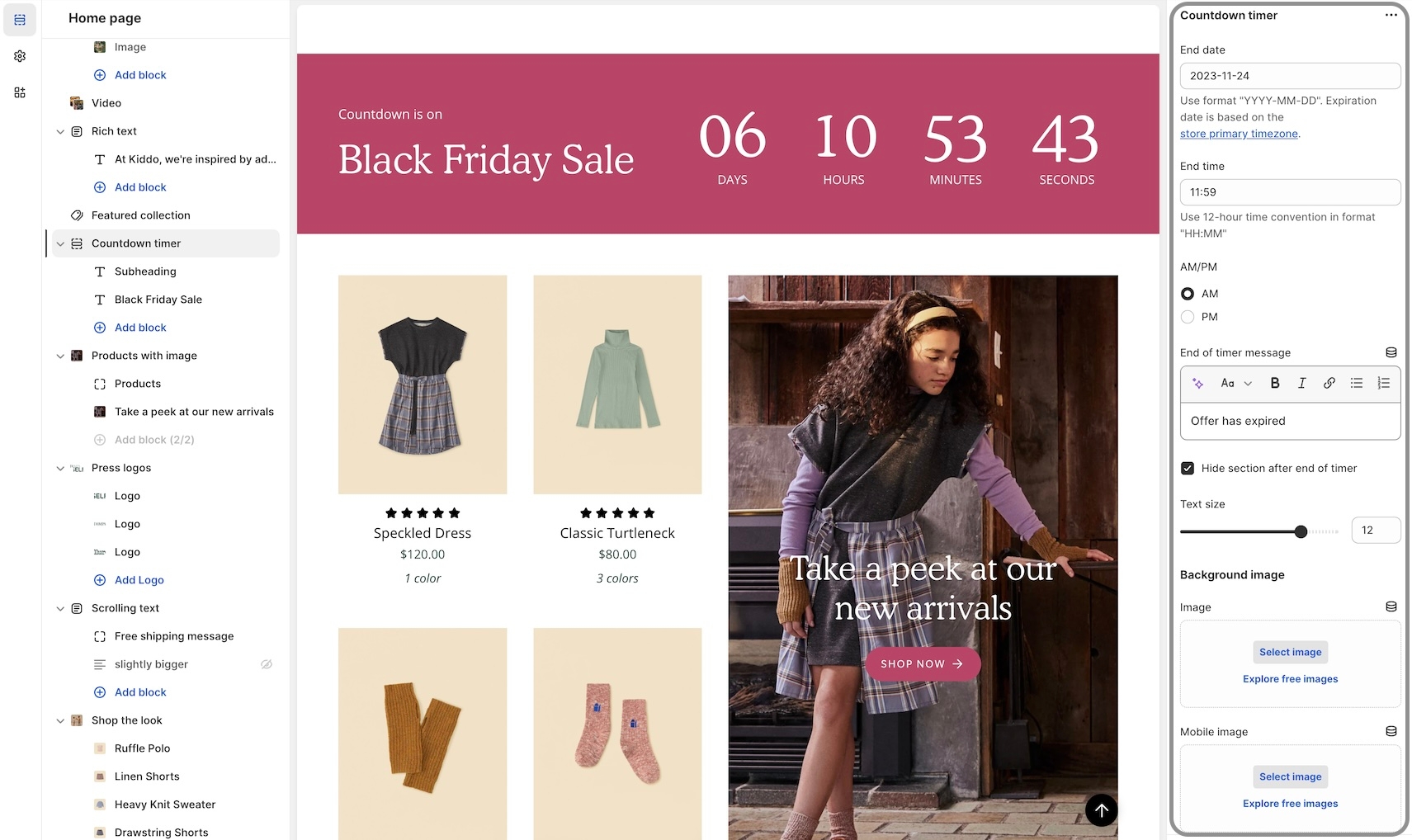 Design custom countdown promotions with background images and solid or gradient colors. Use the expiry features to hide the promotion or display a custom message during the countdown.