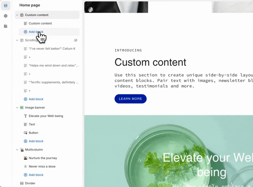 Build a two-column section using two blocks. For example, combine text and a call to action column with a collection, product, image, or video block.
