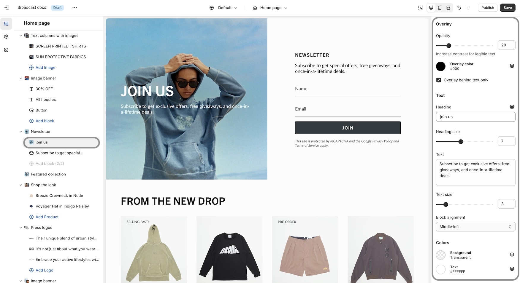 Broadcast provides various methods for adding a newsletter sign-up option to your shop, including the footer and blocks in various sections. This section allows you to promote your newsletter on any page easily.