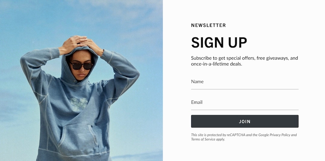 Add the newsletter section to product pages, blog posts, or any page in your store. The image block lets you brand the promotion and increase awareness of your newsletter.