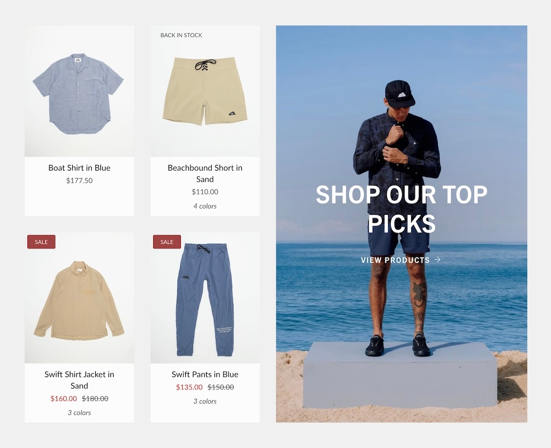 Build an engaging section showcasing products from a collection alongside a prominent image promotion. This modern design by Broadcast captures shoppers' attention while browsing your store pages.
