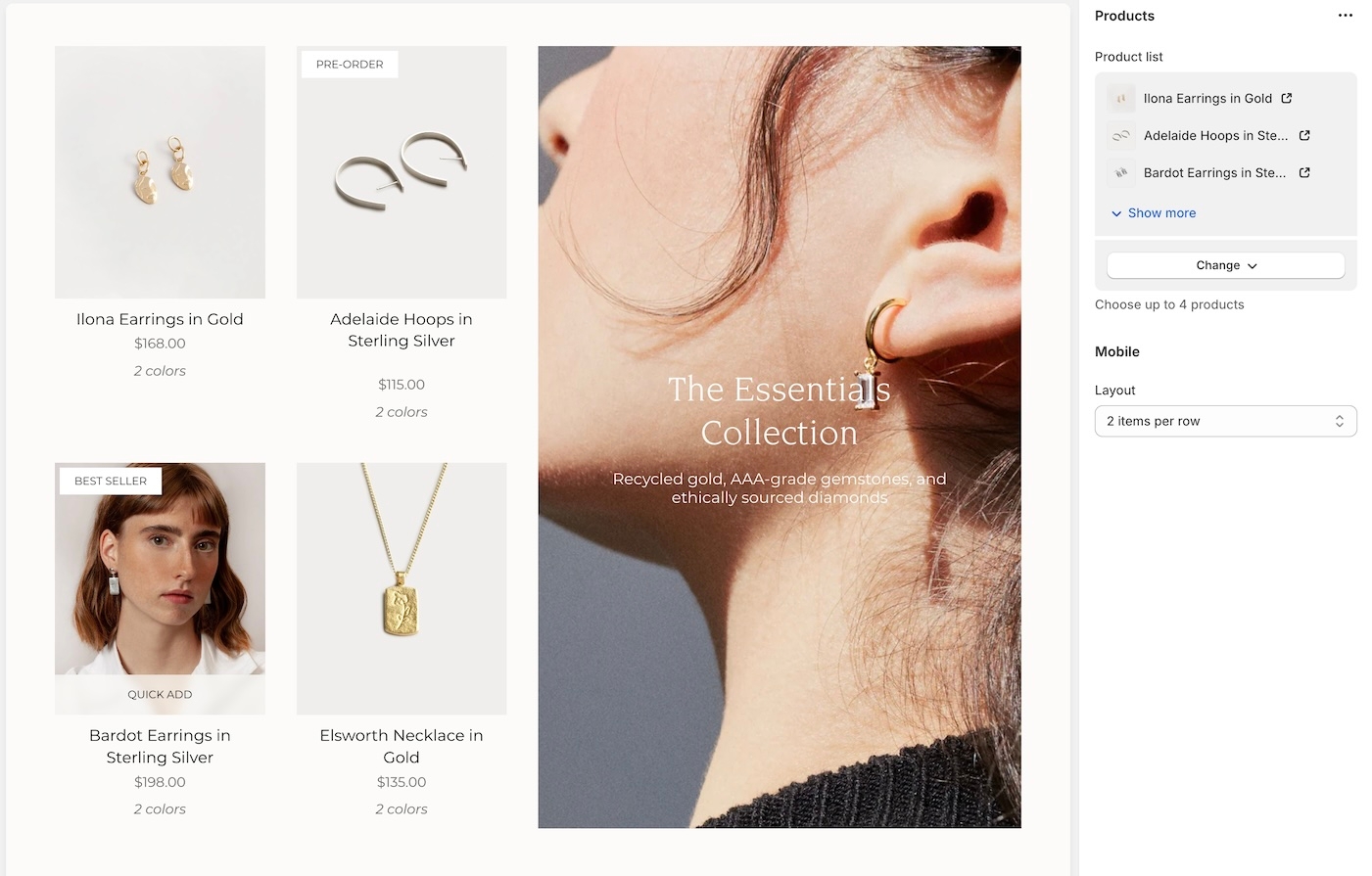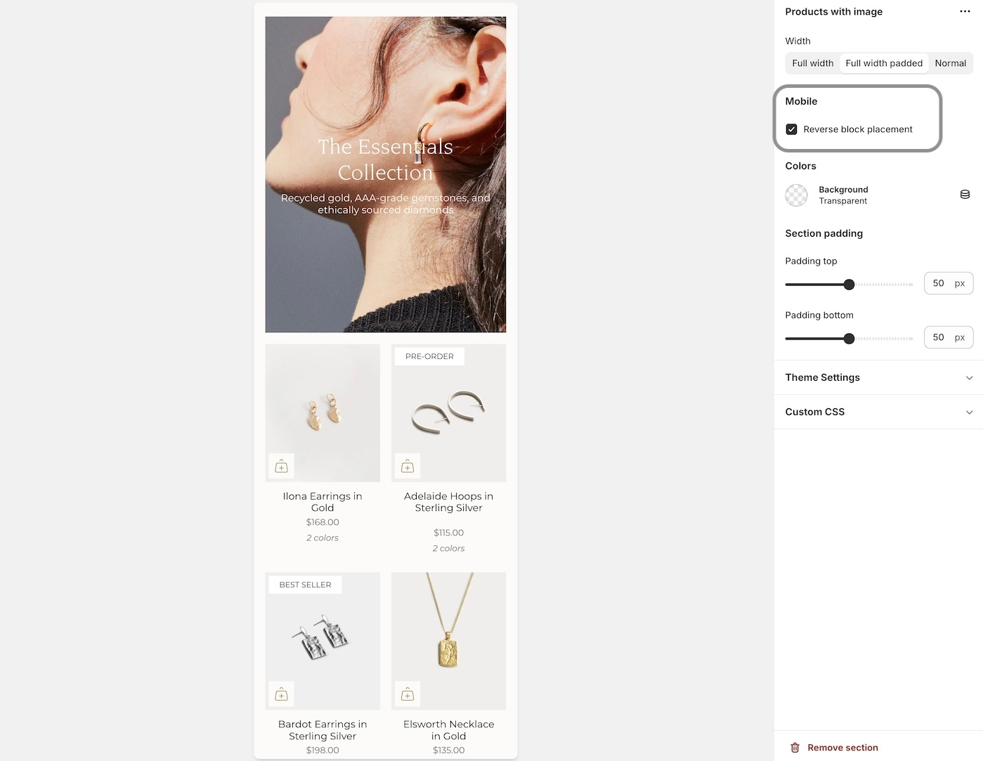 This video demonstrates the section settings and block options for the Products with image section, including mobile layouts:
