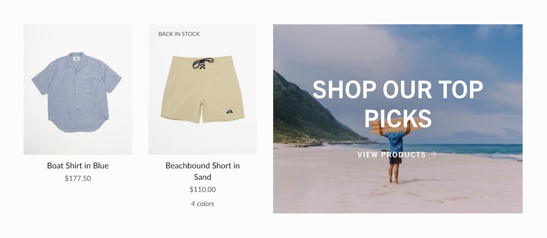 When using four products for your section, choose a tall image to span two rows of products. A wide-aspect ratio image will work best for two products.