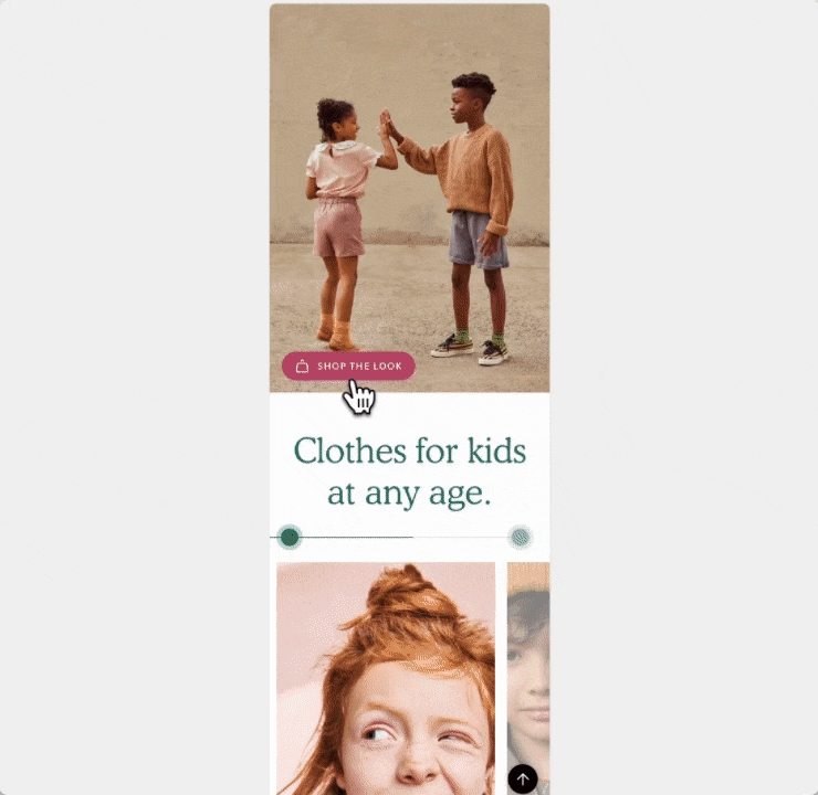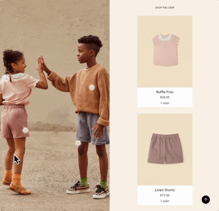 Use it as a static image to promote products. Or display the product dots, which link to the products, making it easier to find the right one. Perfect for any page, including Lookbooks.