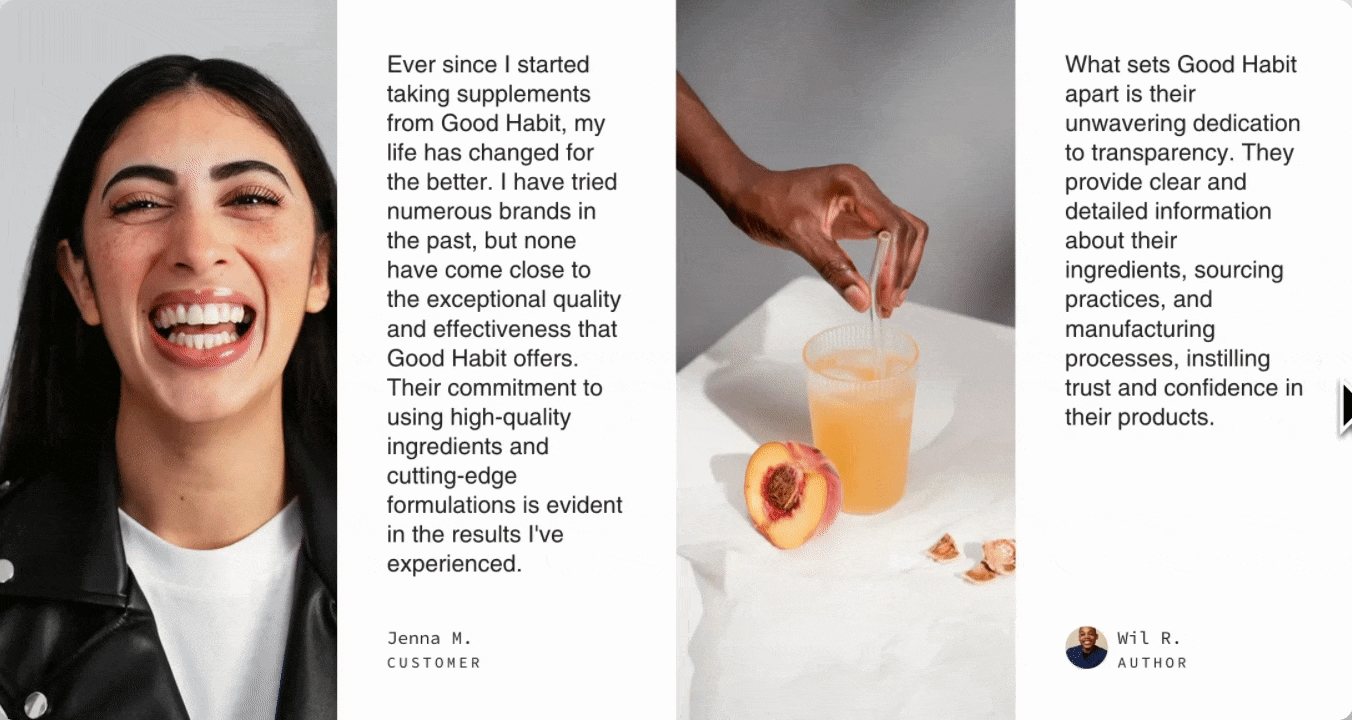 Compact to add on any page to build trust and confidence with your brand. Two image options are available to showcase a product and profile information.