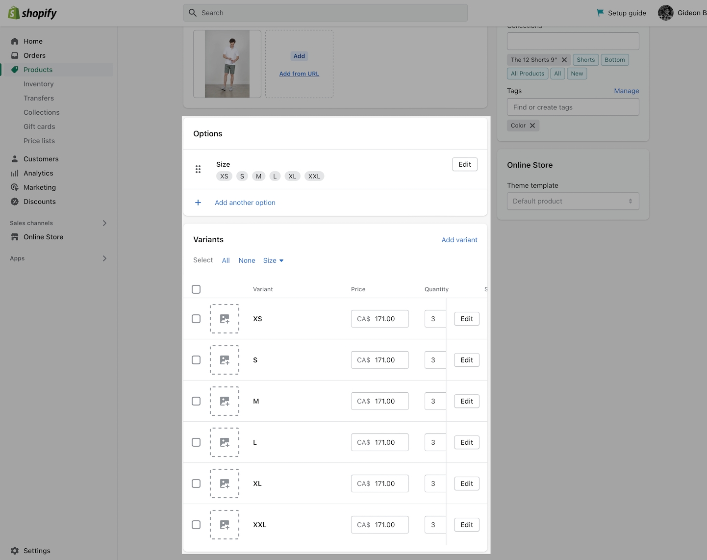 Tip: Create the first product with sizes and prices, then duplicate that product add new images, and adjust the description, inventory, and prices.