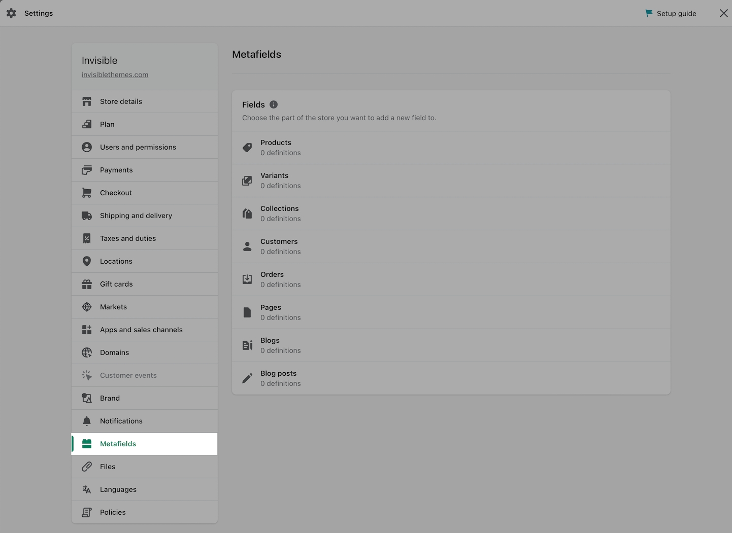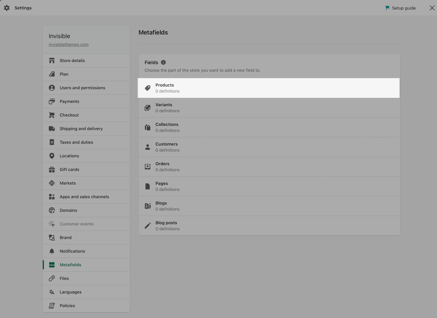 There are two product metafields definitions required to connect each of the products together and generate linked swatches.