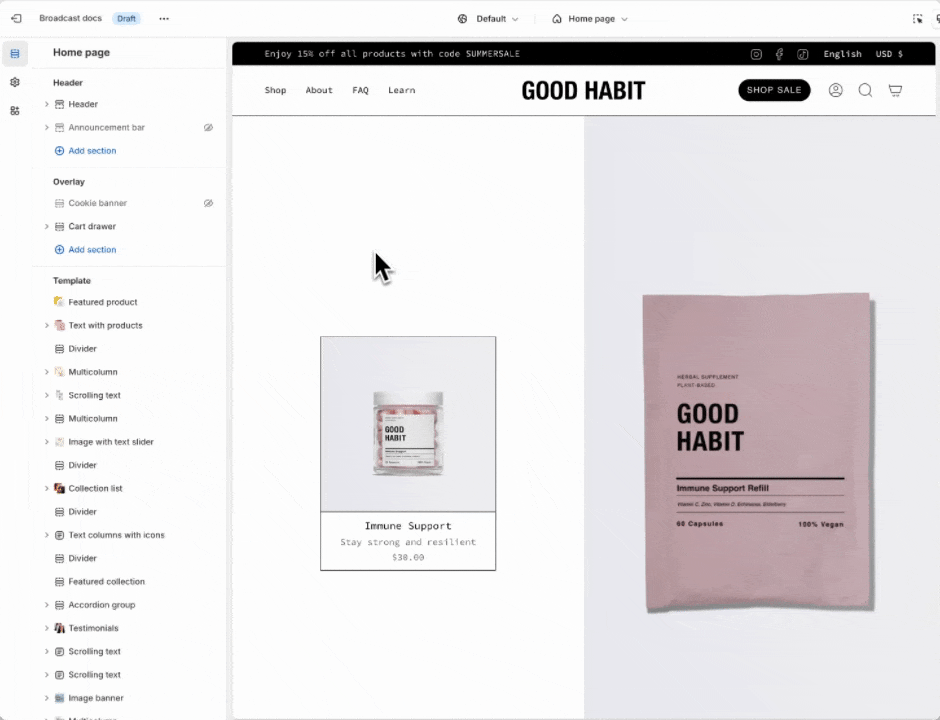Tip: Most theme-wide settings are found here. When designing your store, you'll find many important options in the theme settings. Explore each accordion to find all the global settings and options found in Broadcast.