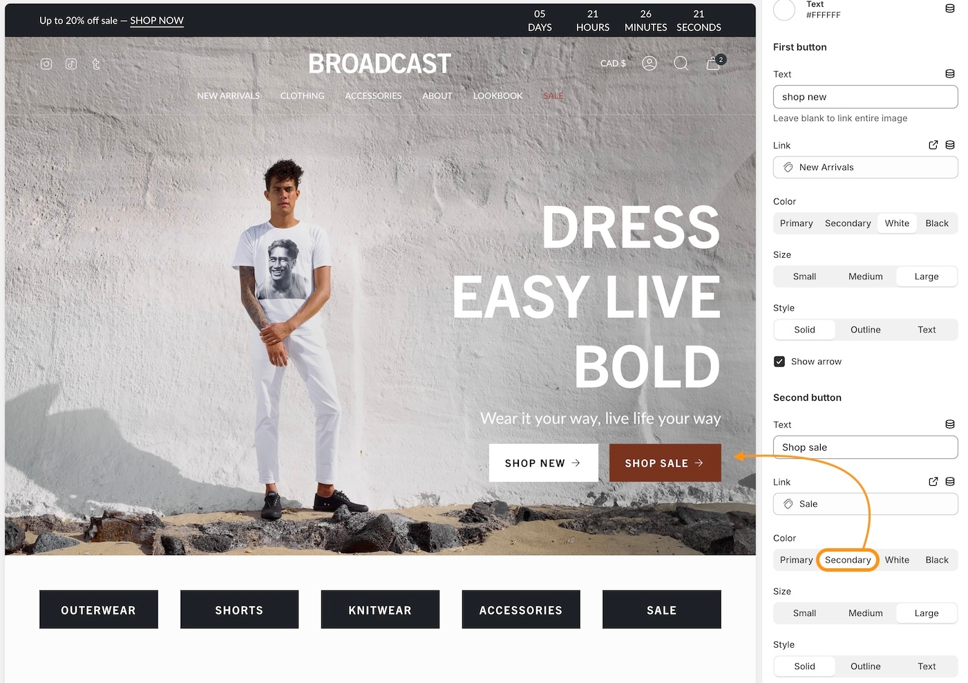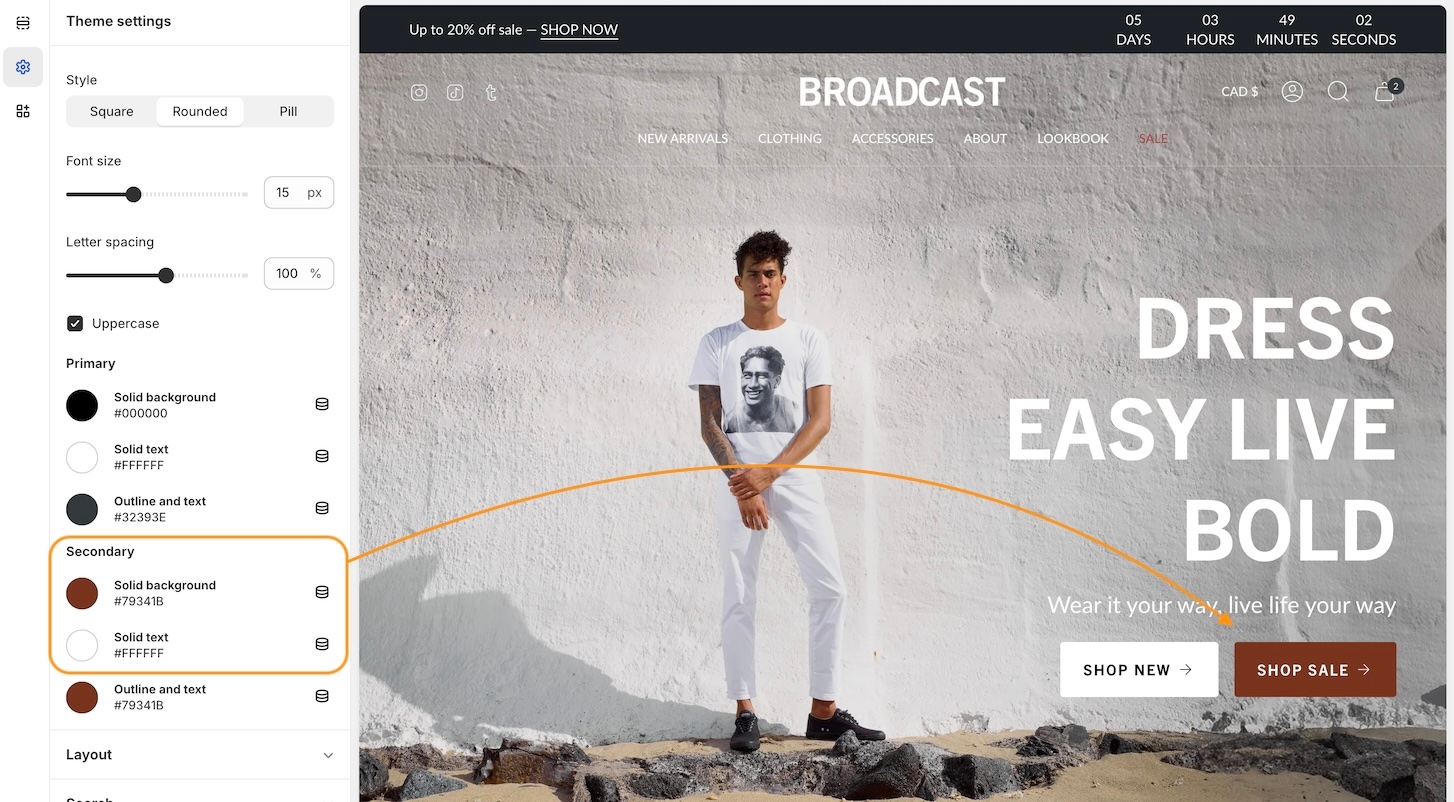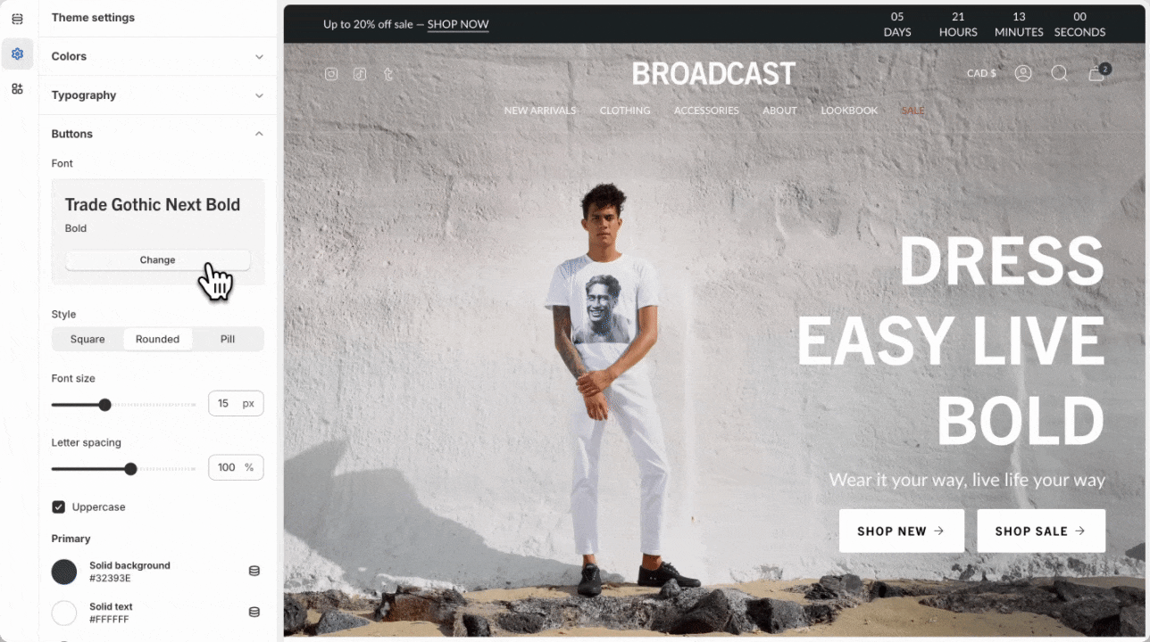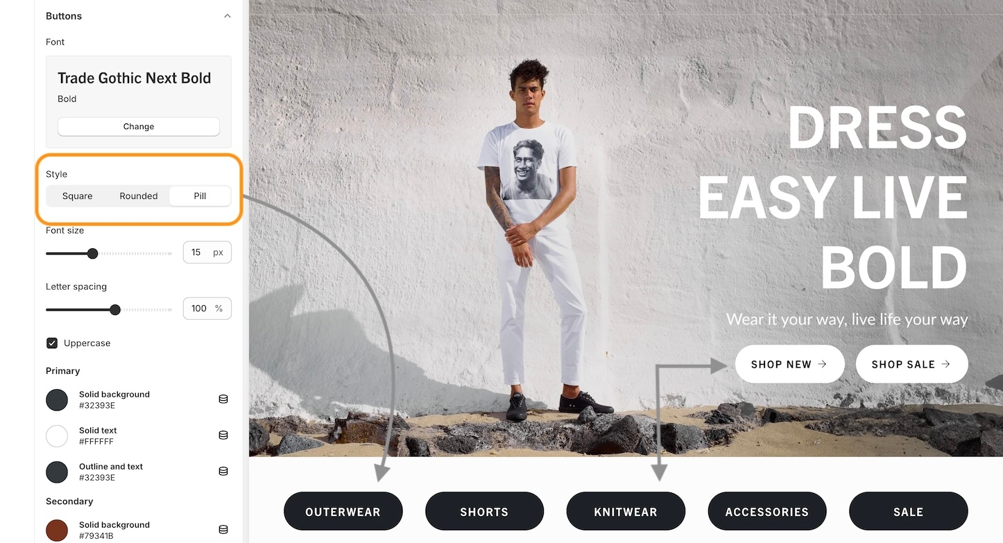 Broadcast includes different button style options. In these settings, choose a style that will be applied to all buttons throughout your shop. Button shapes included are square, rounded, and pill.