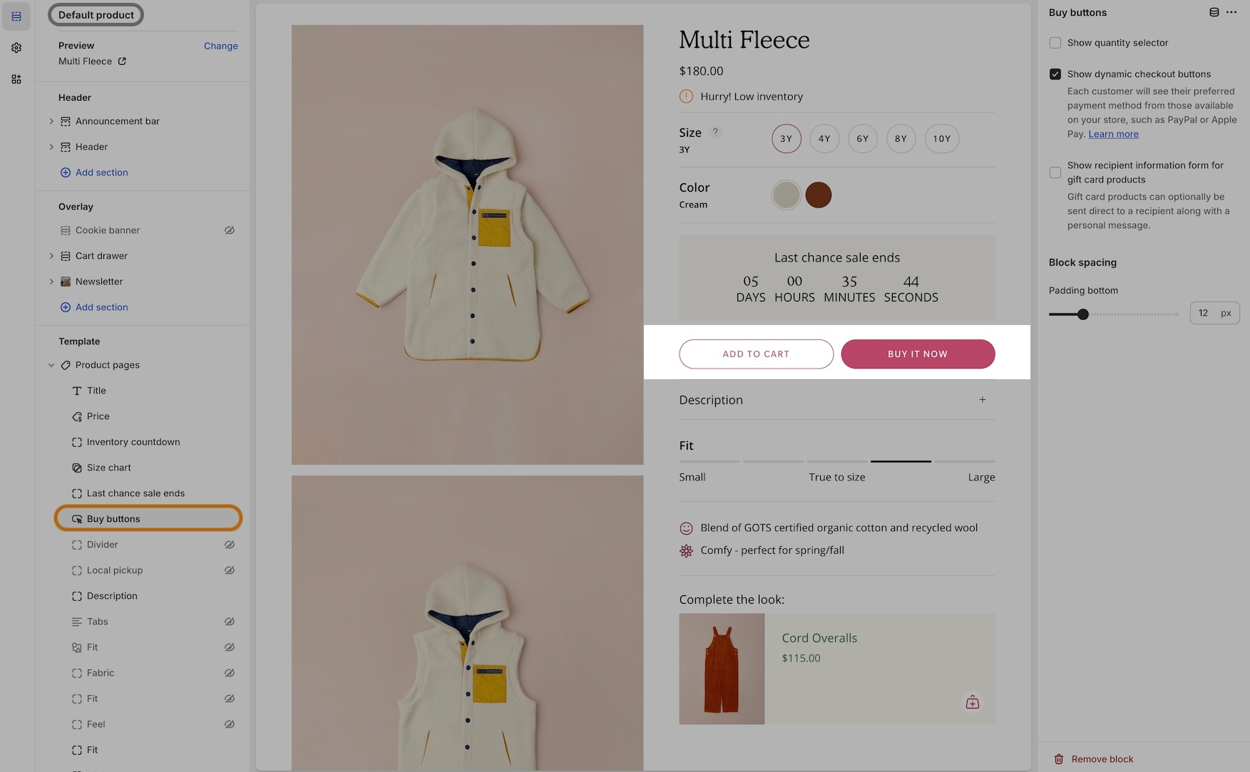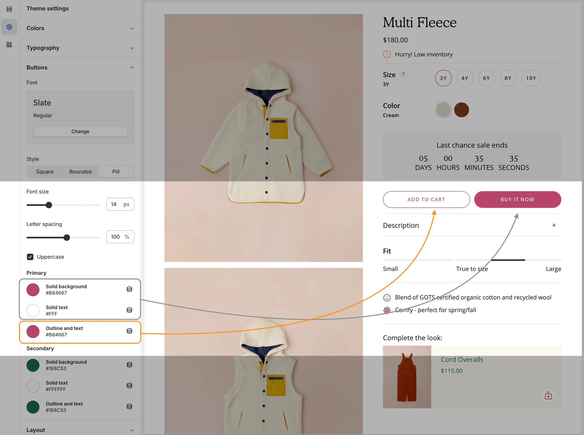 When both buttons, 'Add to Cart' and 'Buy it Now,' are used, the 'Buy it Now' button adopts the primary solid background and primary solid text colors.