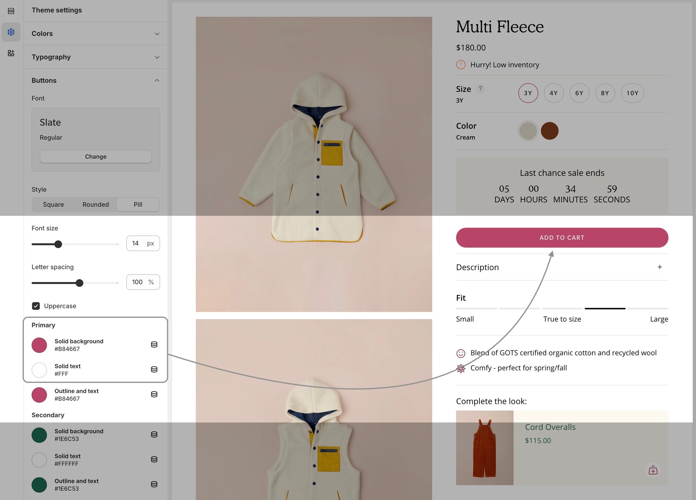 The pill shape brings a modern design to buttons, with a large radius on each corner. Shorter buttons like variant options will appear circular.