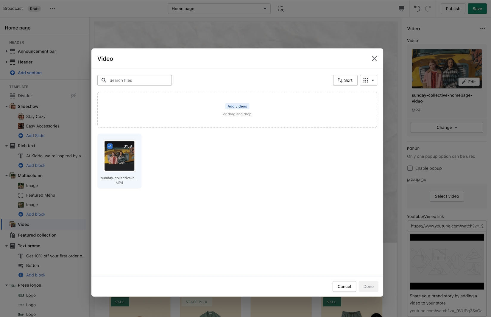 Now you can quickly choose an MP4 video from your files library or upload directly with the newly improved Shopify interface: