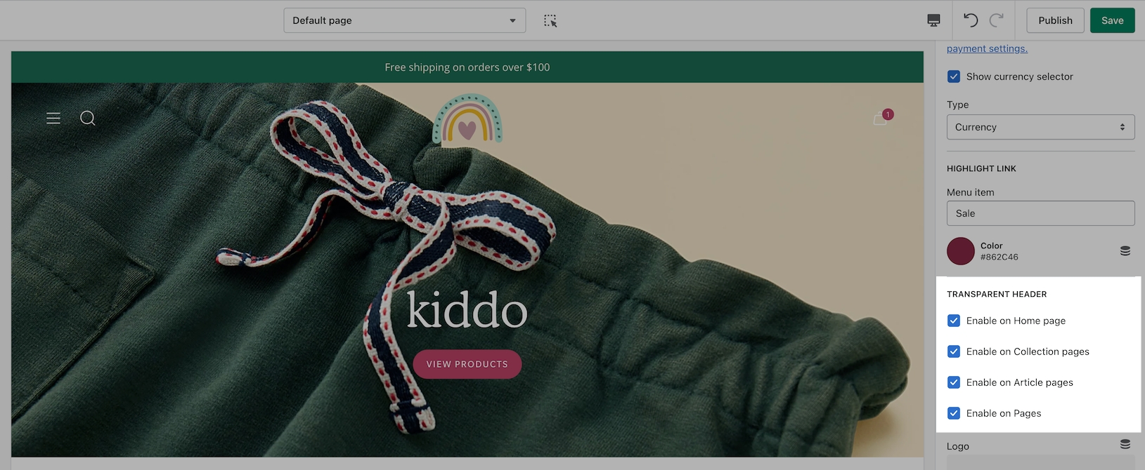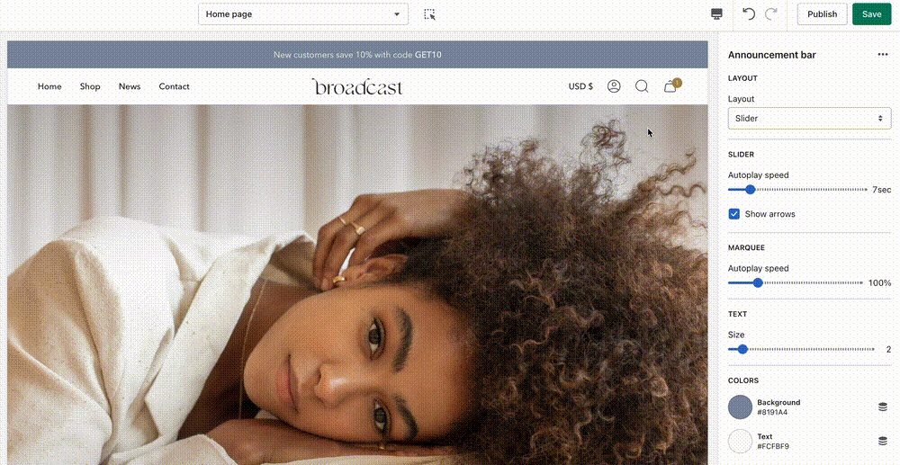 We've added arrows on hover to the announcement bar. When the layout setting is Slider, you now have the ability to show sliders in the same color as the message text: