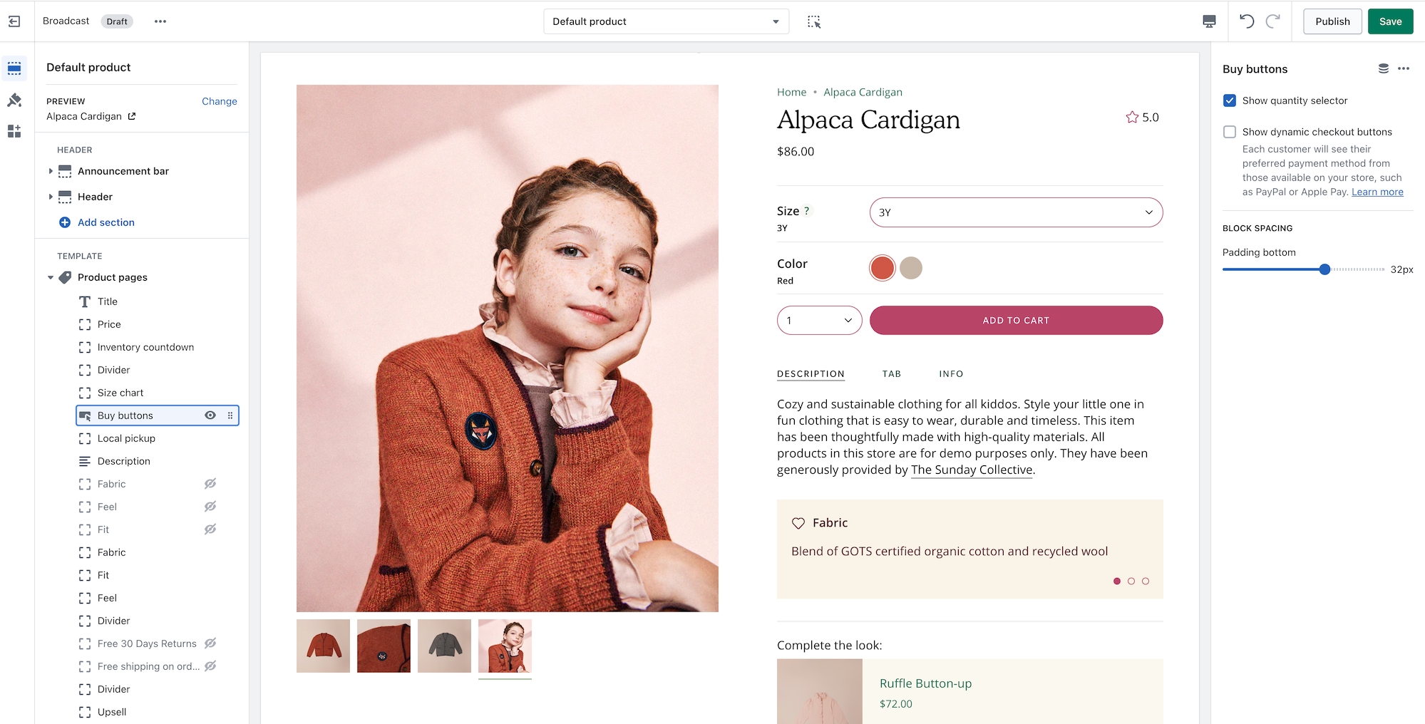 Both the Modern and Classic styles support the Quantity button next to the Add to Cart button. Use the Buy Button block settings to activate it: