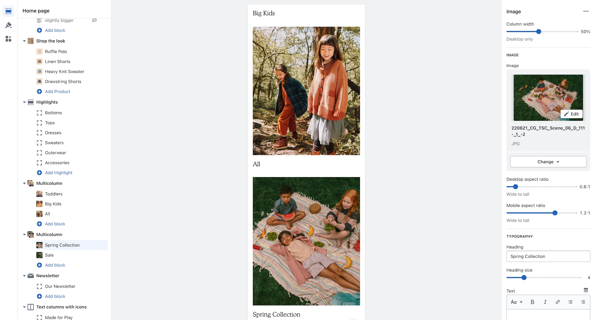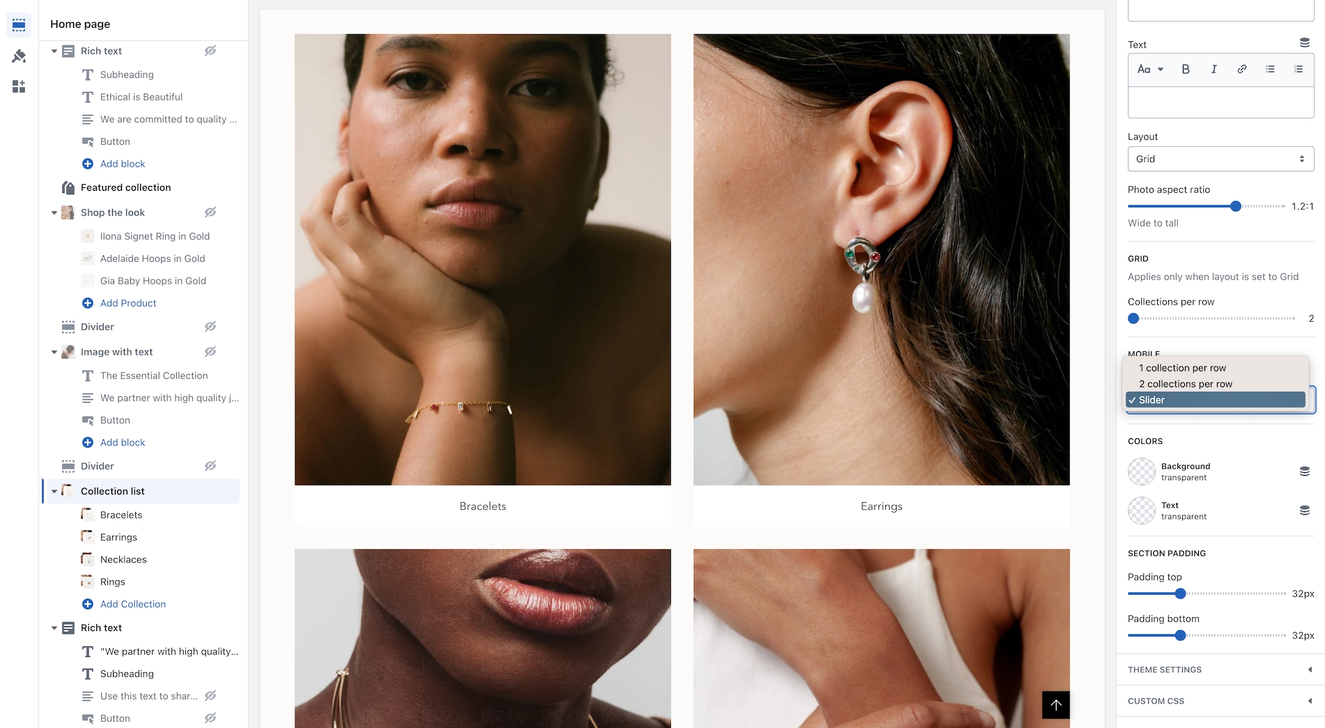 Broadcast now includes mobile layout styles for the Collection list section. You can choose to display 1 or 2 collections per row or the mobile slider: