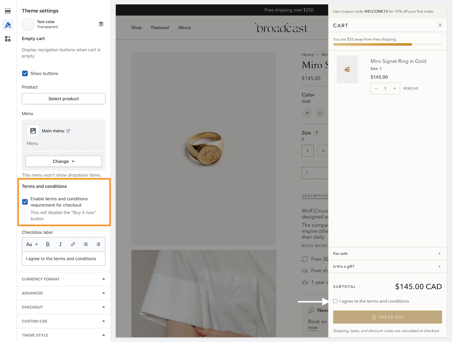Use the Theme settings -> Cart to toggle. When enabled, the customer must check the box in order to proceed with checkout.