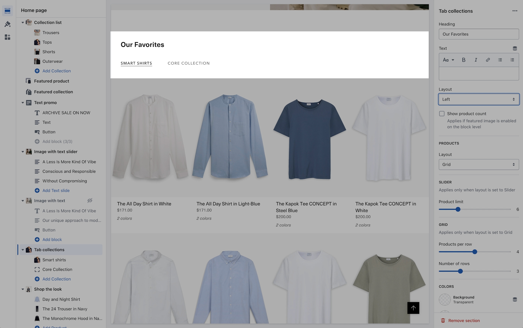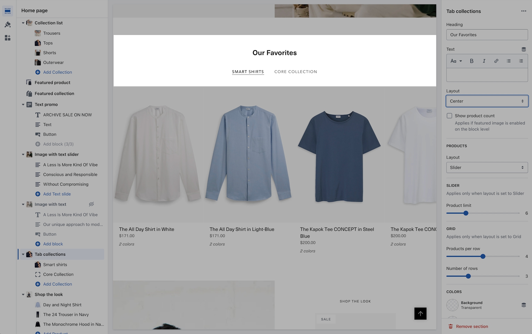 A new grid layout option for the desktop has been added for displaying the products within a tabbed collection. You can easily choose between the slider style or the new grid option: